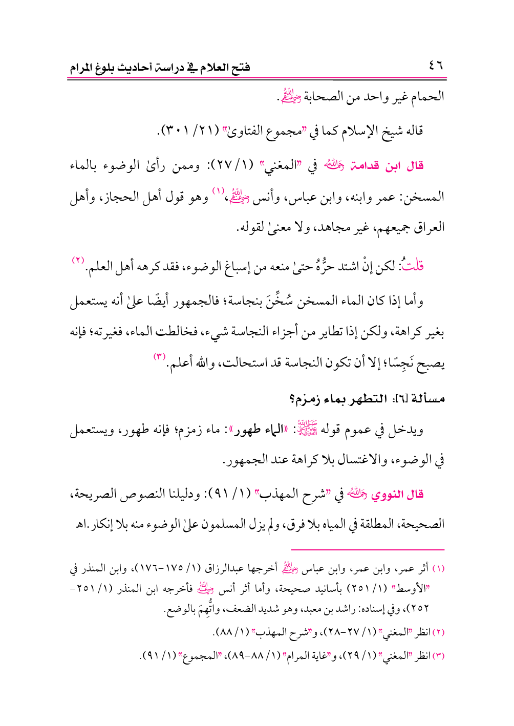 قال ابن قدامة -رحمه الله- في «المغني» (١/ ٢٧): وممن رأى الوضوء بالماء المسخن: عمر وابنه، وابن عباس، وأنس -رضي الله عنهم-، (¬١) وهو قول أهل الحجاز، وأهل العراق جميعهم، غير مجاهد، ولا معنى لقوله.