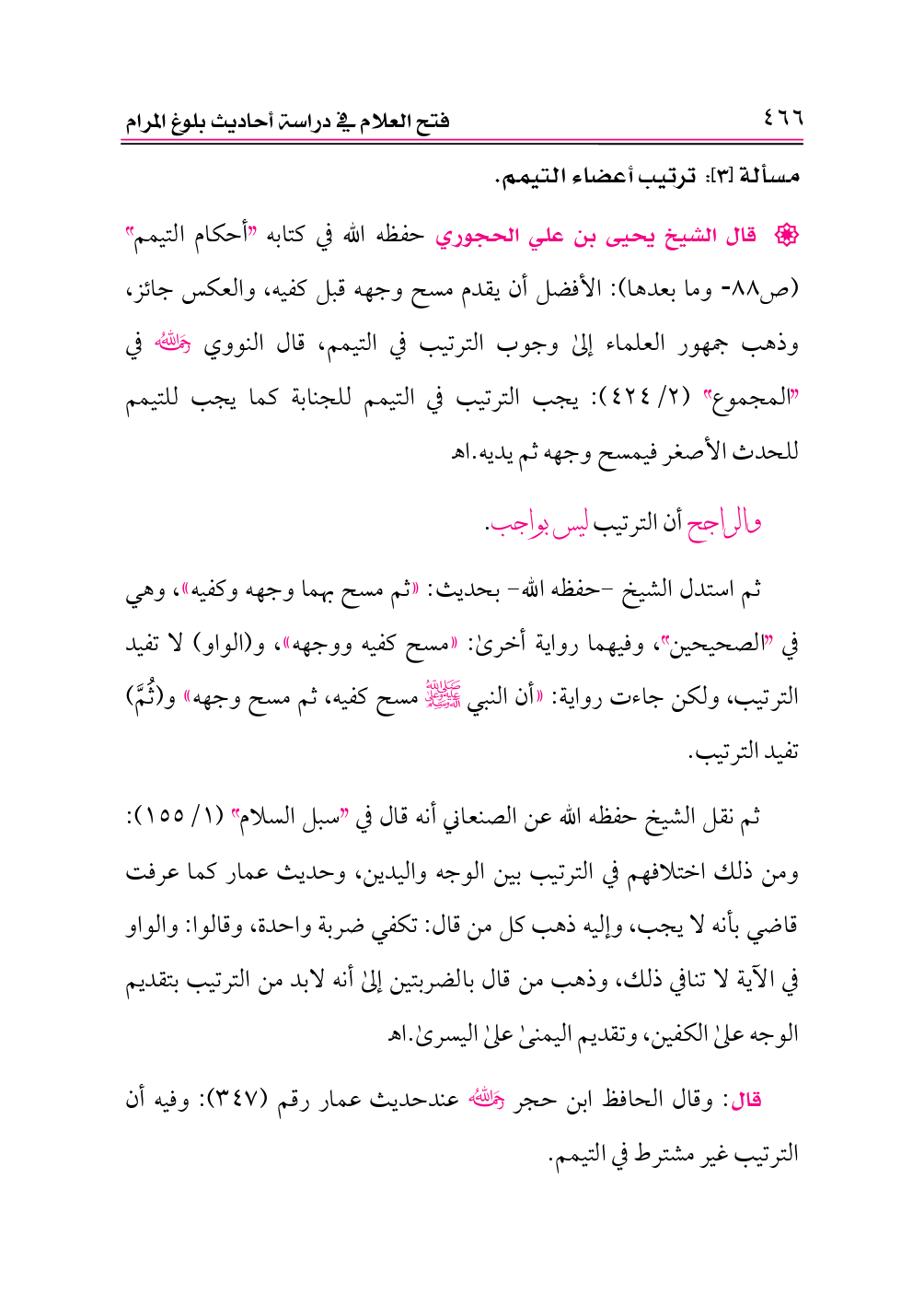 ثم نقل الشيخ حفظه الله عن الصنعاني أنه قال في «سبل السلام» (١/ ١٥٥): ومن ذلك اختلافهم في الترتيب بين الوجه واليدين، وحديث عمار كما عرفت قاضي بأنه لا يجب، وإليه ذهب كل من قال: تكفي ضربة واحدة، وقالوا: والواو في الآية لا تنافي ذلك، وذهب من قال بالضربتين إلى أنه لابد من الترتيب بتقديم الوجه على الكفين، وتقديم اليمنى على اليسرى. اهـ