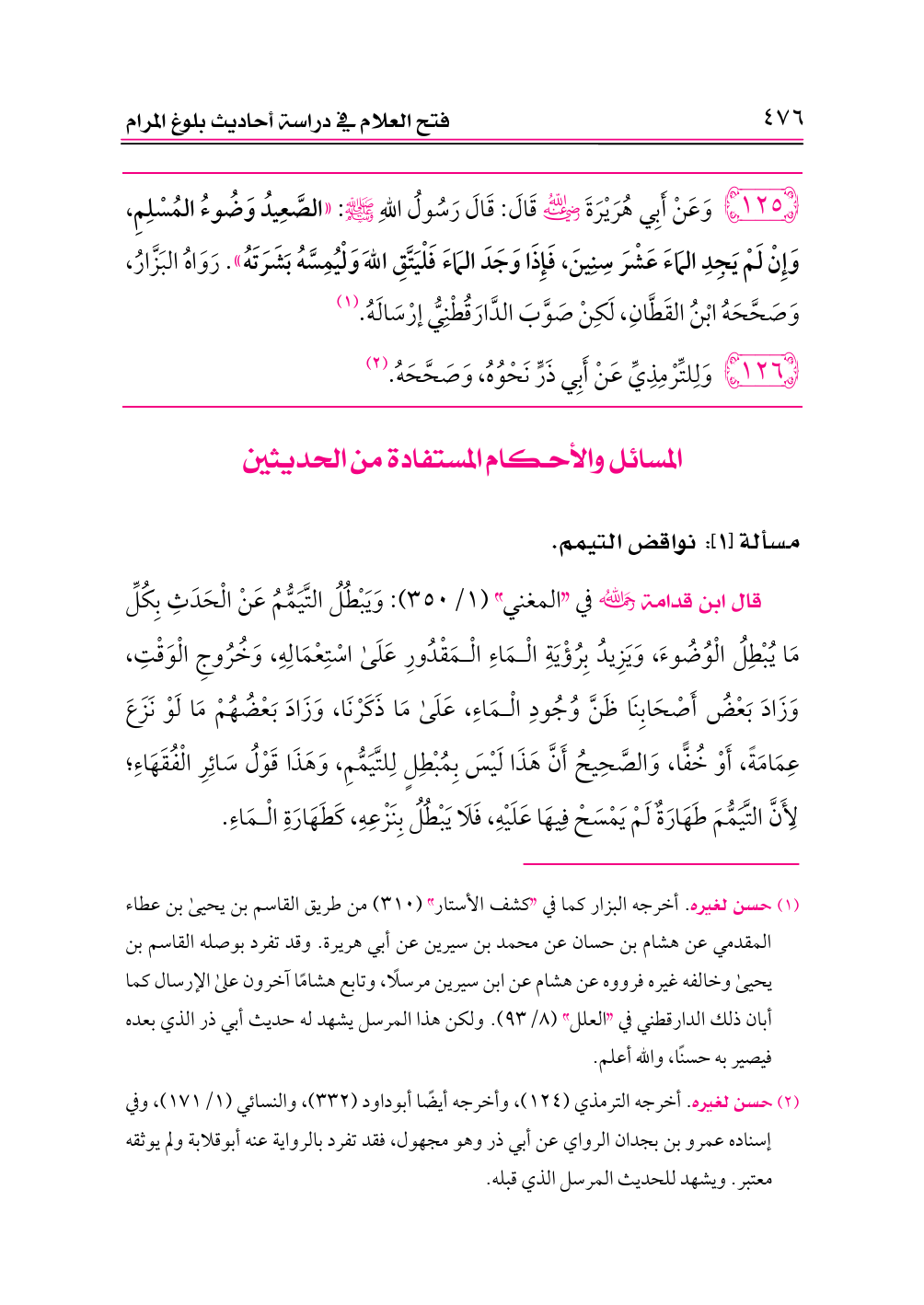 (¬٢) حسن لغيره. أخرجه الترمذي (١٢٤)، وأخرجه أيضًا أبوداود (٣٣٢)، والنسائي (١/ ١٧١)، وفي إسناده عمرو بن بجدان الرواي عن أبي ذر وهو مجهول، فقد تفرد بالرواية عنه أبوقلابة ولم يوثقه معتبر. ويشهد للحديث المرسل الذي قبله.