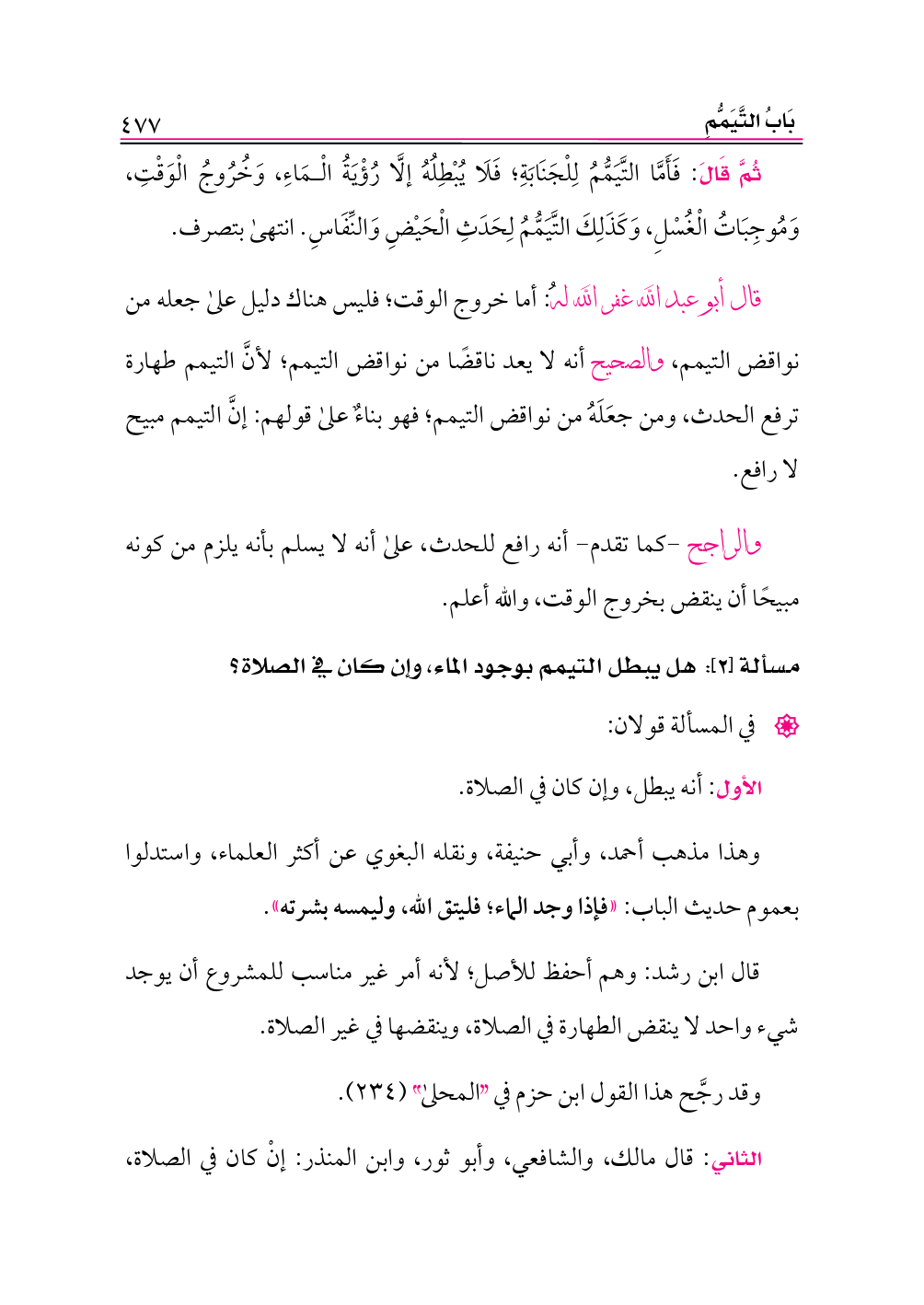 ثُمَّ قَالَ: فَأَمَّا التَّيَمُّمُ لِلْجَنَابَةِ؛ فَلَا يُبْطِلُهُ إلَّا رُؤْيَةُ الْمَاءِ، وَخُرُوجُ الْوَقْتِ، وَمُوجِبَاتُ الْغُسْلِ، وَكَذَلِكَ التَّيَمُّمُ لِحَدَثِ الْحَيْضِ وَالنِّفَاسِ. انتهى بتصرف.