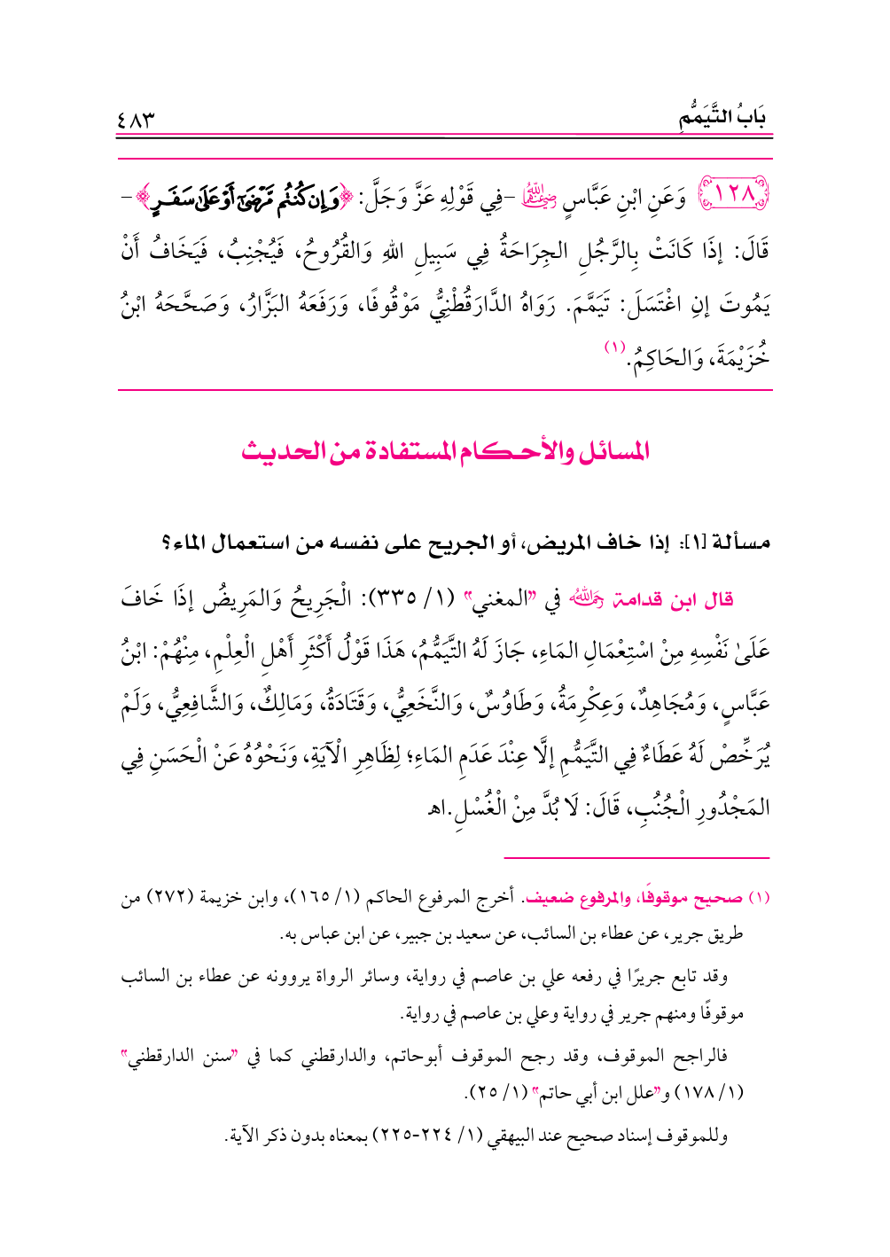 قال ابن قدامة -رحمه الله- في «المغني» (١/ ٣٣٥): الْجَرِيحُ وَالمَرِيضُ إذَا خَافَ عَلَى نَفْسِهِ مِنْ اسْتِعْمَالِ المَاءِ، جَازَ لَهُ التَّيَمُّمُ، هَذَا قَوْلُ أَكْثَرِ أَهْلِ الْعِلْمِ، مِنْهُمْ: ابْنُ عَبَّاسٍ، وَمُجَاهِدٌ، وَعِكْرِمَةُ، وَطَاوُسٌ، وَالنَّخَعِيُّ، وَقَتَادَةُ، وَمَالِكٌ، وَالشَّافِعِيُّ، وَلَمْ يُرَخِّصْ لَهُ عَطَاءٌ فِي التَّيَمُّمِ إلَّا عِنْدَ عَدَمِ المَاءِ؛ لِظَاهِرِ الْآيَةِ، وَنَحْوُهُ عَنْ الْحَسَنِ فِي المَجْدُورِ الْجُنُبِ، قَالَ: لَا بُدَّ مِنْ الْغُسْلِ. اهـ