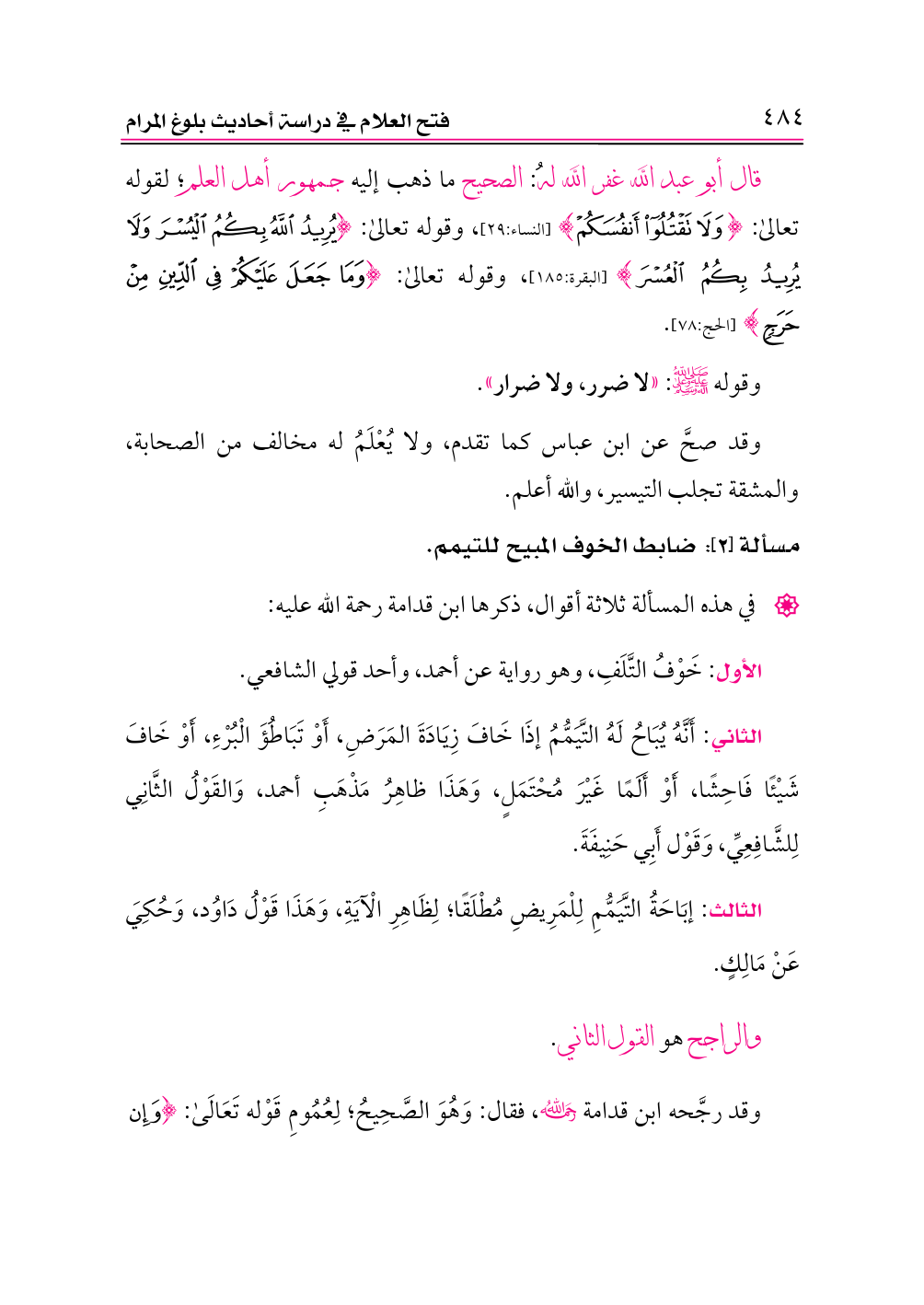 الثاني: أَنَّهُ يُبَاحُ لَهُ التَّيَمُّمُ إذَا خَافَ زِيَادَةَ المَرَضِ، أَوْ تَبَاطُؤَ الْبُرْءِ، أَوْ خَافَ شَيْئًا فَاحِشًا، أَوْ أَلَمًا غَيْرَ مُحْتَمَلٍ، وَهَذَا ظاهِرُ مَذْهَبِ أحمد، وَالقَوْلُ الثَّانِي لِلشَّافِعِيِّ، وَقَوْل أَبِي حَنِيفَةَ.