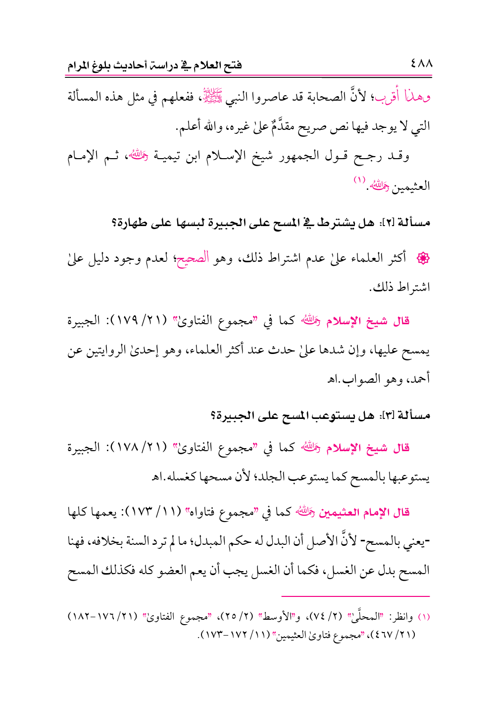 قال شيخ الإسلام -رحمه الله- كما في «مجموع الفتاوى» (٢١/ ١٧٩): الجبيرة يمسح عليها، وإن شدها على حدث عند أكثر العلماء، وهو إحدى الروايتين عن أحمد، وهو الصواب. اهـ