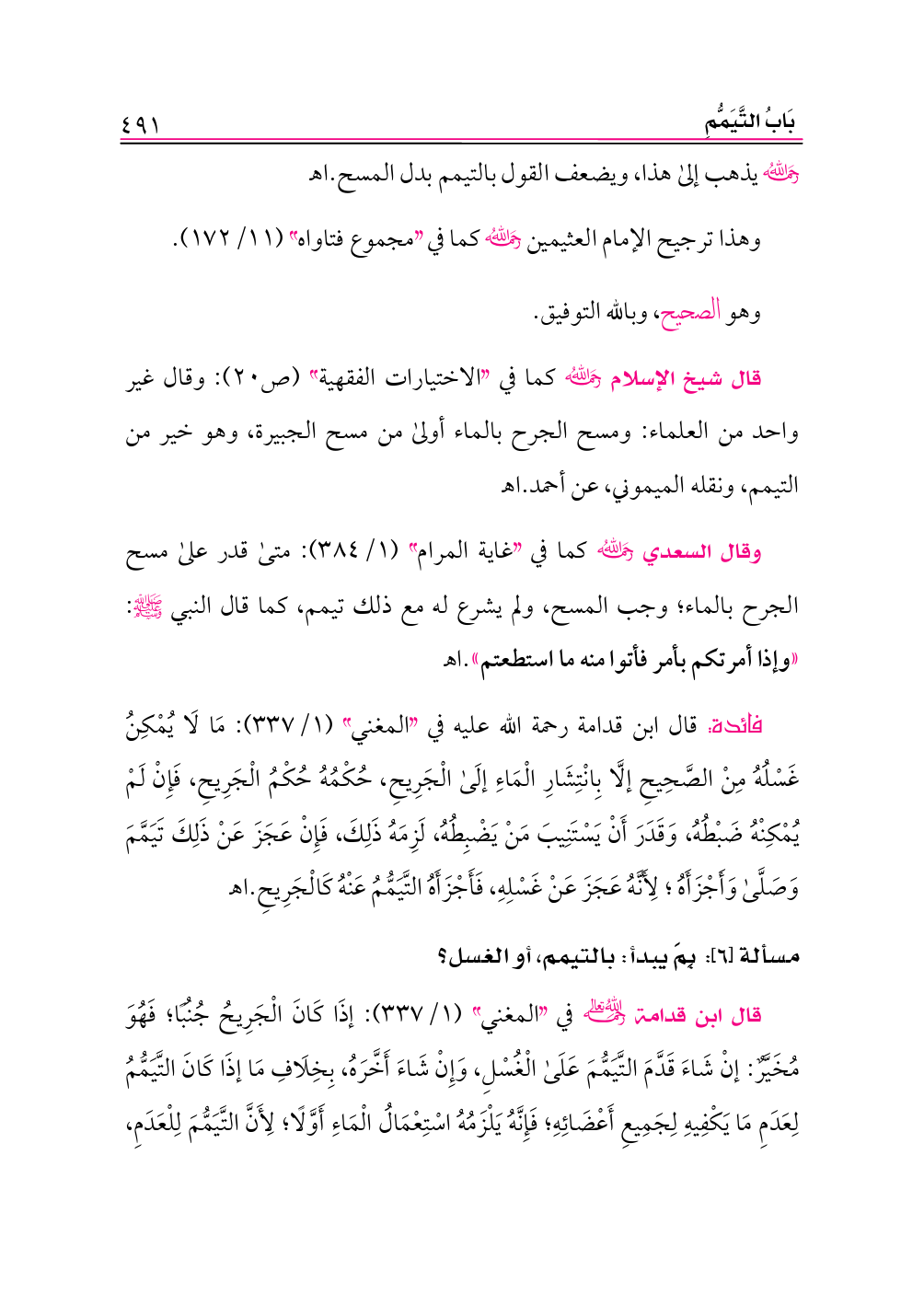 وقال السعدي -رحمه الله- كما في «غاية المرام» (١/ ٣٨٤): متى قدر على مسح الجرح بالماء؛ وجب المسح، ولم يشرع له مع ذلك تيمم، كما قال النبي - صلى الله عليه وسلم -: «وإذا أمرتكم بأمر فأتوا منه ما استطعتم».اهـ