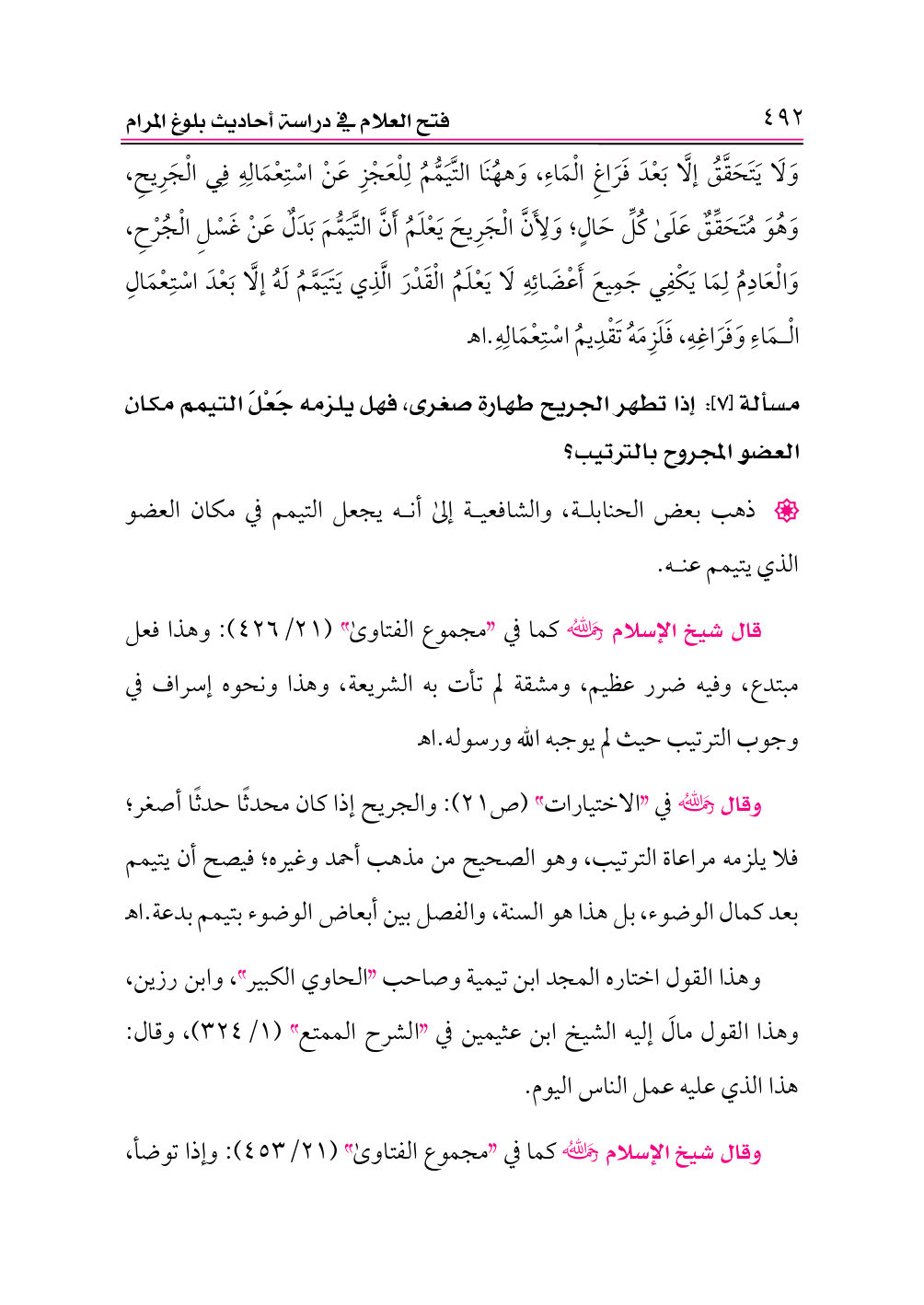 وقال -رحمه الله- في «الاختيارات» (ص ٢١): والجريح إذا كان محدثًا حدثًا أصغر؛ فلا يلزمه مراعاة الترتيب، وهو الصحيح من مذهب أحمد وغيره؛ فيصح أن يتيمم بعد كمال الوضوء، بل هذا هو السنة، والفصل بين أبعاض الوضوء بتيمم بدعة. اهـ