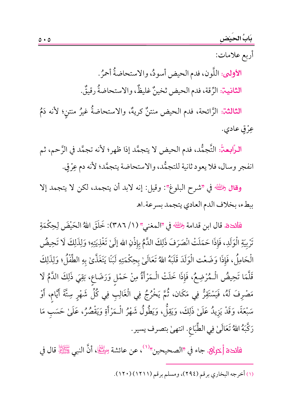 فائدة: قال ابن قدامة -رحمه الله- في «المغني» (١/ ٣٨٦): خَلَقَ اللهُ الحَيْضَ لِحِكْمَةِ تَرْبِيَةِ الْوَلَدِ، فَإِذَا حَمَلَتْ انْصَرَفَ ذَلِكَ الدَّمُ بِإِذْنِ الله إلَى تَغْذِيَتِهِ؛ وَلِذَلِكَ لَا تَحِيضُ الْحَامِلُ، فَإِذَا وَضَعْت الْوَلَدَ قَلَبَهُ اللهُ تَعَالَى بِحِكْمَتِهِ لَبَنًا يَتَغَذَّى بِهِ الطِّفْلُ؛ وَلِذَلِكَ قَلَّمَا تَحِيضُ الْمُرْضِعُ، فَإِذَا خَلَتْ الْمَرْأَةُ مِنْ حَمْلٍ وَرَضَاعٍ، بَقِيَ ذَلِكَ الدَّمُ لَا مَصْرِفَ لَهُ، فَيَسْتَقِرُّ فِي مَكَان، ثُمَّ يَخْرُجُ فِي الْغَالِبِ فِي كُلِّ شَهْرٍ سِتَّةَ أَيَّامٍ، أَوْ سَبْعَةً، وَقَدْ يَزِيدُ عَلَى ذَلِكَ، وَيَقِلُّ، وَيَطُولُ شَهْرُ الْمَرْأَةِ وَيَقْصُرُ، عَلَى حَسَبِ مَا رَكَّبَهُ اللهُ تَعَالَى فِي الطِّبَاعِ. انتهى بتصرف يسير.