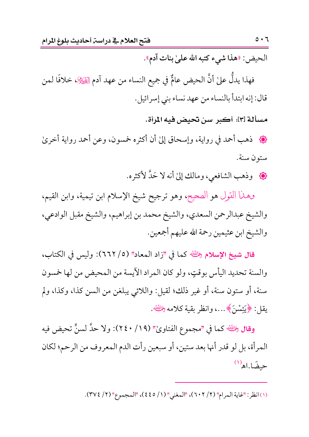 وقال -رحمه الله- كما في «مجموع الفتاوى» (١٩/ ٢٤٠): ولا حدَّ لسنٍّ تحيض فيه المرأة، بل لو قدر أنها بعد ستين، أو سبعين رأت الدم المعروف من الرحم؛ لكان حيضًا. اهـ (¬٢)