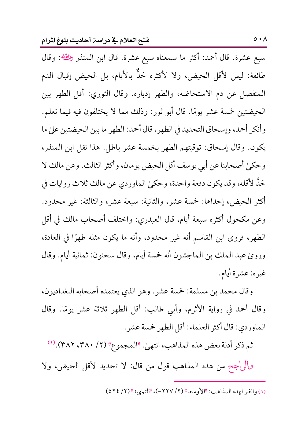 وقال محمد بن مسلمة: خمسة عشر. وهو الذي يعتمده أصحابه البغداديون، وقال أحمد في رواية الأثرم، وأبي طالب: أقل الطهر ثلاثة عشر يومًا. وقال الماوردي: قال أكثر العلماء: أقل الطهر خمسة عشر.