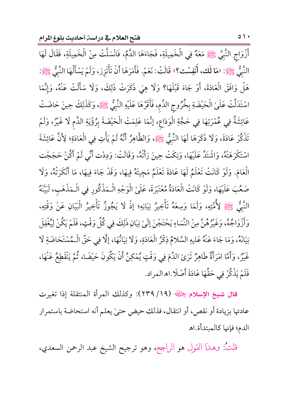أَزْوَاجِ النَّبِيِّ - صلى الله عليه وسلم - مَعَهُ فِي الْخَمِيلَةِ، فَجَاءَهَا الدَّمُ، فَانْسَلَّتْ مِنْ الْخَمِيلَةِ، فَقَالَ لَهَا النَّبِيُّ - صلى الله عليه وسلم -: «مَا لَك، أَنَفِسْت؟» قَالَتْ: نَعَمْ. فَأَمَرَهَا أَنْ تَأْتَزِرَ، وَلَمْ يَسْأَلْهَا النَّبِيُّ - صلى الله عليه وسلم -: هَلْ وَافَقَ الْعَادَةَ، أَوْ جَاءَ قَبْلَهَا؟ وَلَا هِيَ ذَكَرَتْ ذَلِكَ، وَلَا سَأَلَتْ عَنْهُ، وَإِنَّمَا اسْتَدَلَّتْ عَلَى الْحَيْضَةِ بِخُرُوجِ الدَّمِ، فَأَقَرَّهَا عَلَيْهِ النَّبِيُّ - صلى الله عليه وسلم -، وَكَذَلِكَ حِينَ حَاضَتْ عَائِشَةُ فِي عُمْرَتِهَا فِي حَجَّةِ الْوَدَاعِ، إنَّمَا عَلِمَتْ الْحَيْضَةَ بِرُؤْيَةِ الدَّمِ لَا غَيْرُ، وَلَمْ تَذْكُرْ عَادَةً، وَلَا ذَكَرَهَا لَهَا النَّبِيُّ - صلى الله عليه وسلم -، وَالظَّاهِرُ أَنَّهُ لَمْ يَأْتِ فِي الْعَادَةِ؛ لِأَنَّ عَائِشَةَ اسْتَكْرَهَتْهُ، وَاشْتَدَّ عَلَيْهَا، وَبَكَتْ حِينَ رَأَتْهُ، وَقَالَتْ: وَدِدْت أَنِّي لَمْ أَكُنْ حَجَجْت الْعَامَ.