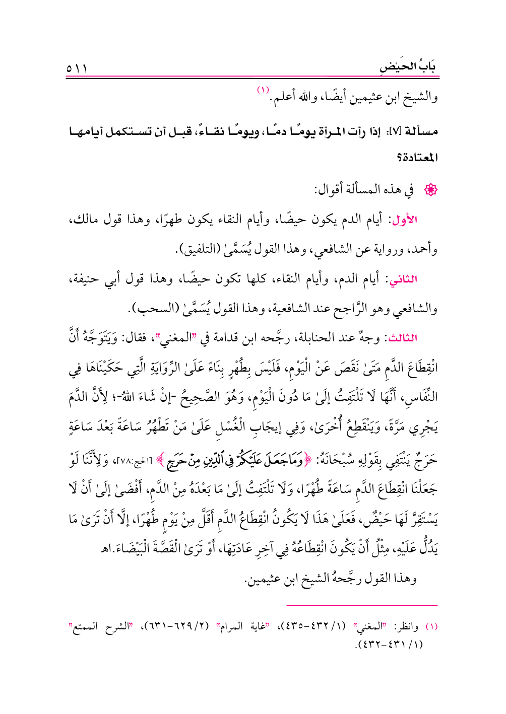 مسألة [٧]: إذا رأت المرأة يومًا دمًا، ويومًا نقاءً، قبل أن تستكمل أيامها المعتادة؟