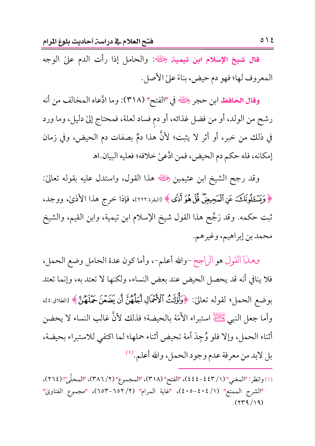 وهذا القول هو الراجح -والله أعلم-، وأما كون عدة الحامل وضع الحمل، فلا ينافي أنه قد يحصل الحيض عند بعض النساء، ولكنها لا تعتد به، وإنما تعتد بوضع الحمل؛ لقوله تعالى: {وَأُولَاتُ الْأَحْمَالِ أَجَلُهُنَّ أَنْ يَضَعْنَ حَمْلَهُنَّ} [الطلاق:٤]، وأما جعل النبي -صلى الله عليه وعلى آله وسلم- استبراء الأَمَة بالحيضة؛ فذلك لأنَّ غالب النساء لا يحضن أثناء الحمل، وإلا فلو وُجِدَ أمة تحيض أثناء حملها؛ لما اكتفي للاستبراء بحيضة، بل لابد من معرفة عدم وجود الحمل، والله أعلم. (¬١)