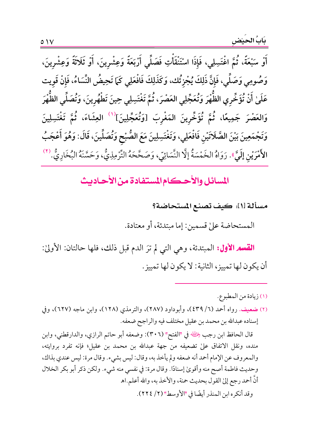 قال الحافظ ابن رجب -رحمه الله- في «الفتح» (٣٠٦): وضعفه أبو حاتم الرازي، والدارقطني، وابن منده، ونقل الاتفاق على تضعيفه من جهة عبدالله بن محمد بن عقيل؛ فإنه تفرد بروايته، والمعروف عن الإمام أحمد أنه ضعفه ولم يأخذ به، وقال: ليس بشيء. وقال مرة: ليس عندي بذاك، وحديث فاطمة أصح منه وأقوى إسنادًا. وقال مرة: في نفسي منه شيء. ولكن ذكر أبو بكر الخلال أنَّ أحمد رجع إلى القول بحديث حمنة، والأخذ به، والله أعلم. اهـ