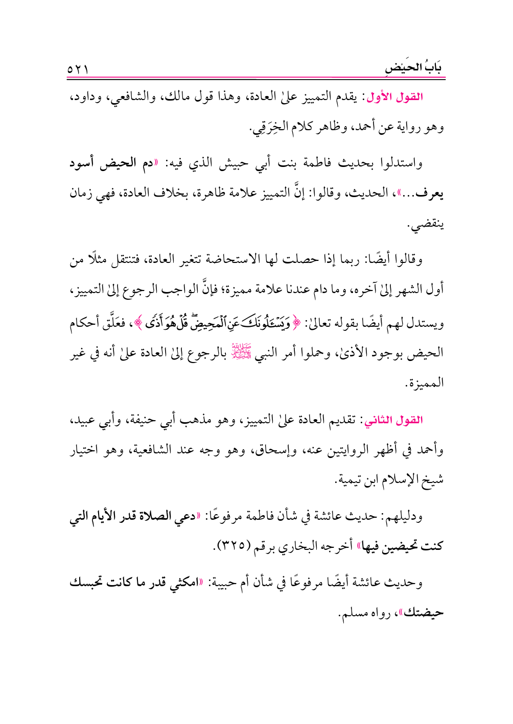 وقالوا أيضًا: ربما إذا حصلت لها الاستحاضة تتغير العادة، فتنتقل مثلًا من أول الشهر إلى آخره، وما دام عندنا علامة مميزة؛ فإنَّ الواجب الرجوع إلى التمييز، ويستدل لهم أيضًا بقوله تعالى: {وَيَسْأَلُونَكَ عَنِ الْمَحِيضِ قُلْ هُوَ أَذًى}، فعَلَّق أحكام الحيض بوجود الأذى، وحملوا أمر النبي -صلى الله عليه وعلى آله وسلم- بالرجوع إلى العادة على أنه في غير المميزة.