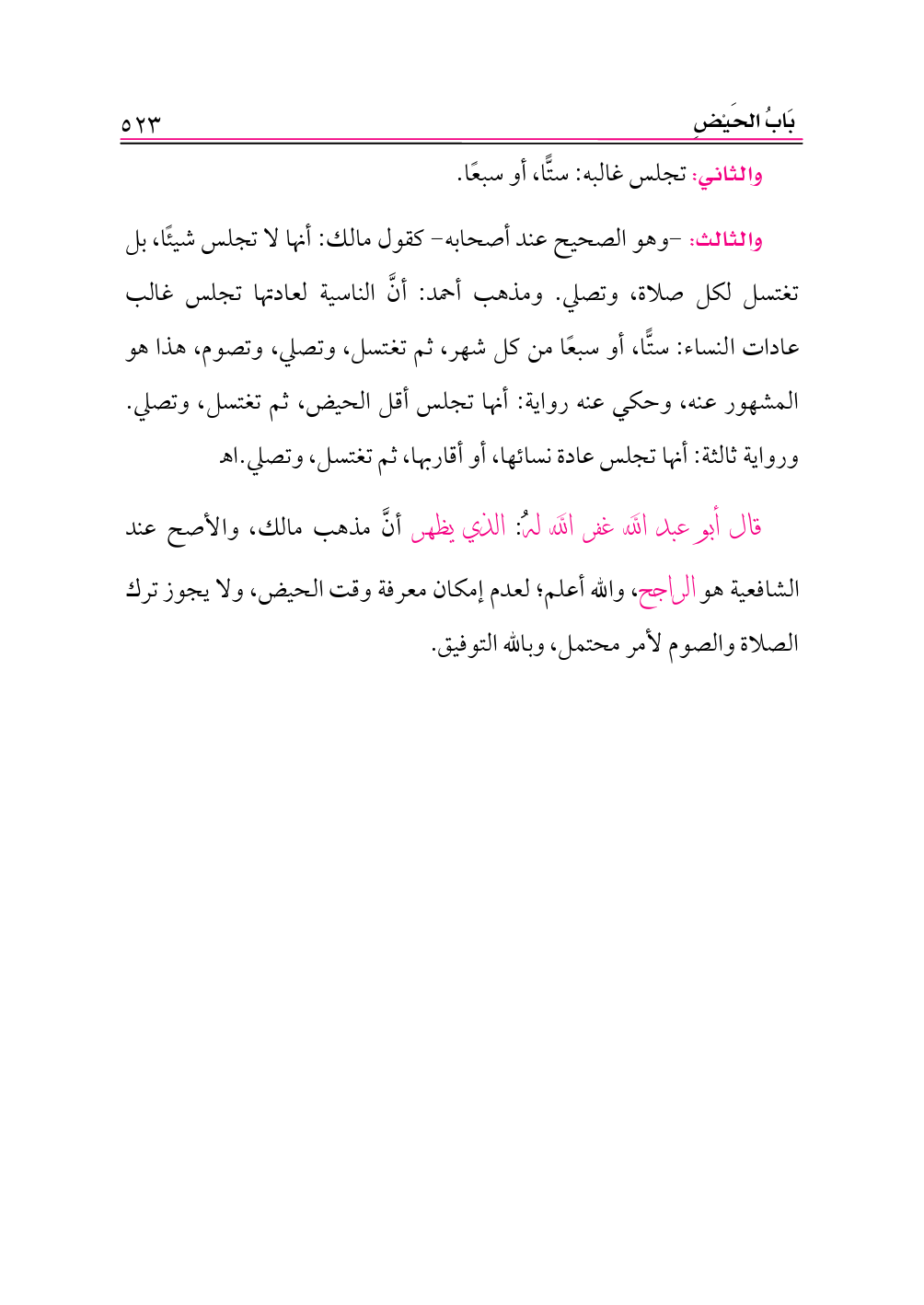 قال أبو عبد الله غفر الله لهُ: الذي يظهر أنَّ مذهب مالك، والأصح عند الشافعية هو الراجح، والله أعلم؛ لعدم إمكان معرفة وقت الحيض، ولا يجوز ترك الصلاة والصوم لأمر محتمل، وبالله التوفيق.
