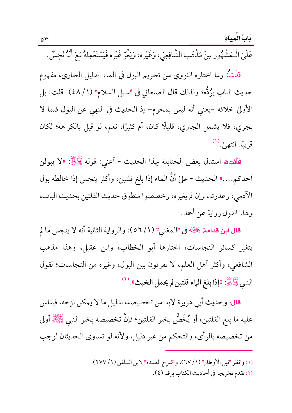 قال: وحديث أبي هريرة لابد من تخصيصه، بدليل ما لا يمكن نزحه، فيقاس عليه ما بلغ القلتين، أو يُخَصُّ بخبر القلتين؛ فإنَّ تخصيصه بخبر النبي -صلى الله عليه وعلى آله وسلم- أولى من تخصيصه بالرأي، والتحكم من غير دليل، ولأنه لو تساوى الحديثان لوجب