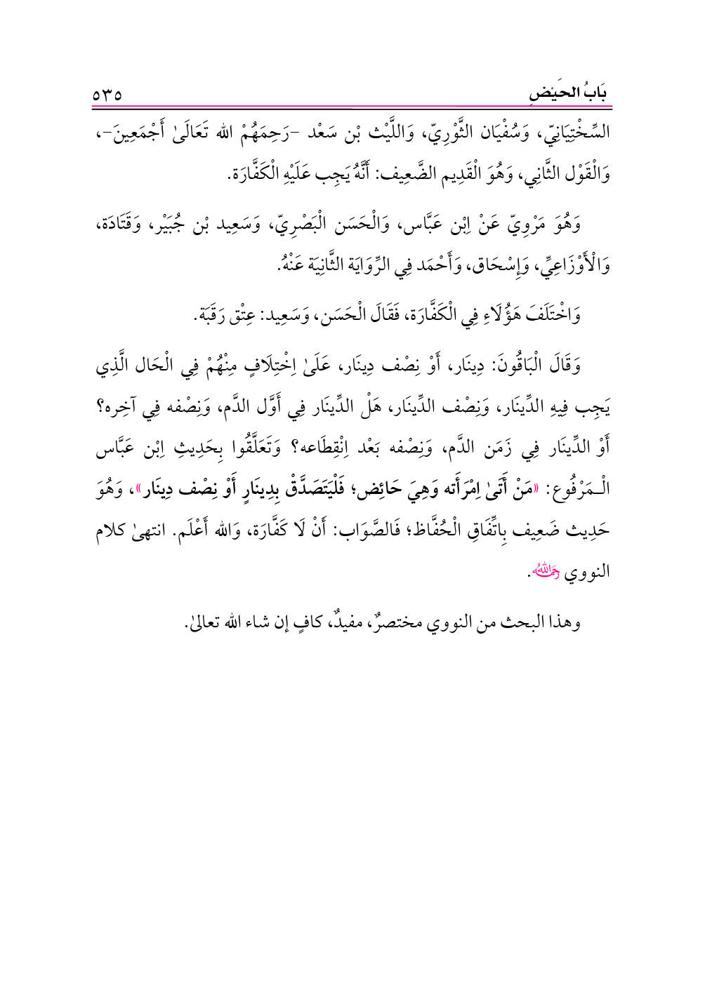 وَقَالَ الْبَاقُونَ: دِينَار، أَوْ نِصْف دِينَار، عَلَى اِخْتِلَافٍ مِنْهُمْ فِي الْحَال الَّذِي يَجِب فِيهِ الدِّينَار، وَنِصْف الدِّينَار، هَلْ الدِّينَار فِي أَوَّل الدَّم، وَنِصْفه فِي آخِره؟ أَوْ الدِّينَار فِي زَمَن الدَّم، وَنِصْفه بَعْد اِنْقِطَاعه؟ وَتَعَلَّقُوا بِحَدِيثِ اِبْن عَبَّاس الْمَرْفُوع: «مَنْ أَتَى اِمْرَأَته وَهِيَ حَائِض؛ فَلْيَتَصَدَّقْ بِدِينَارٍ أَوْ نِصْف دِينَار»، وَهُوَ حَدِيث ضَعِيف بِاتِّفَاقِ الْحُفَّاظ؛ فَالصَّوَاب: أَنْ لَا كَفَّارَة، وَالله أَعْلَم. انتهى كلام النووي -رحمه الله-.
