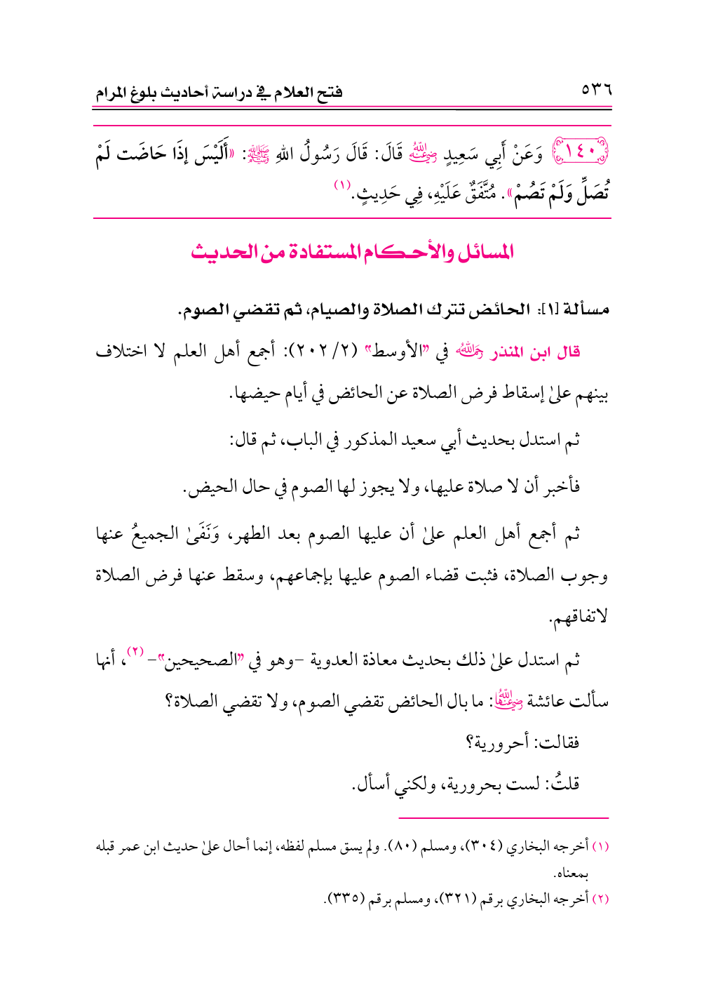 ١٤٠ - وَعَنْ أَبِي سَعِيدٍ -رضي الله عنه- قَالَ: قَالَ رَسُولُ اللهِ - صلى الله عليه وسلم -: «أَلَيْسَ إذَا حَاضَت لَمْ تُصَلِّ وَلَمْ تَصُمْ». مُتَّفَقٌ عَلَيْهِ، فِي حَدِيثٍ. (¬١)