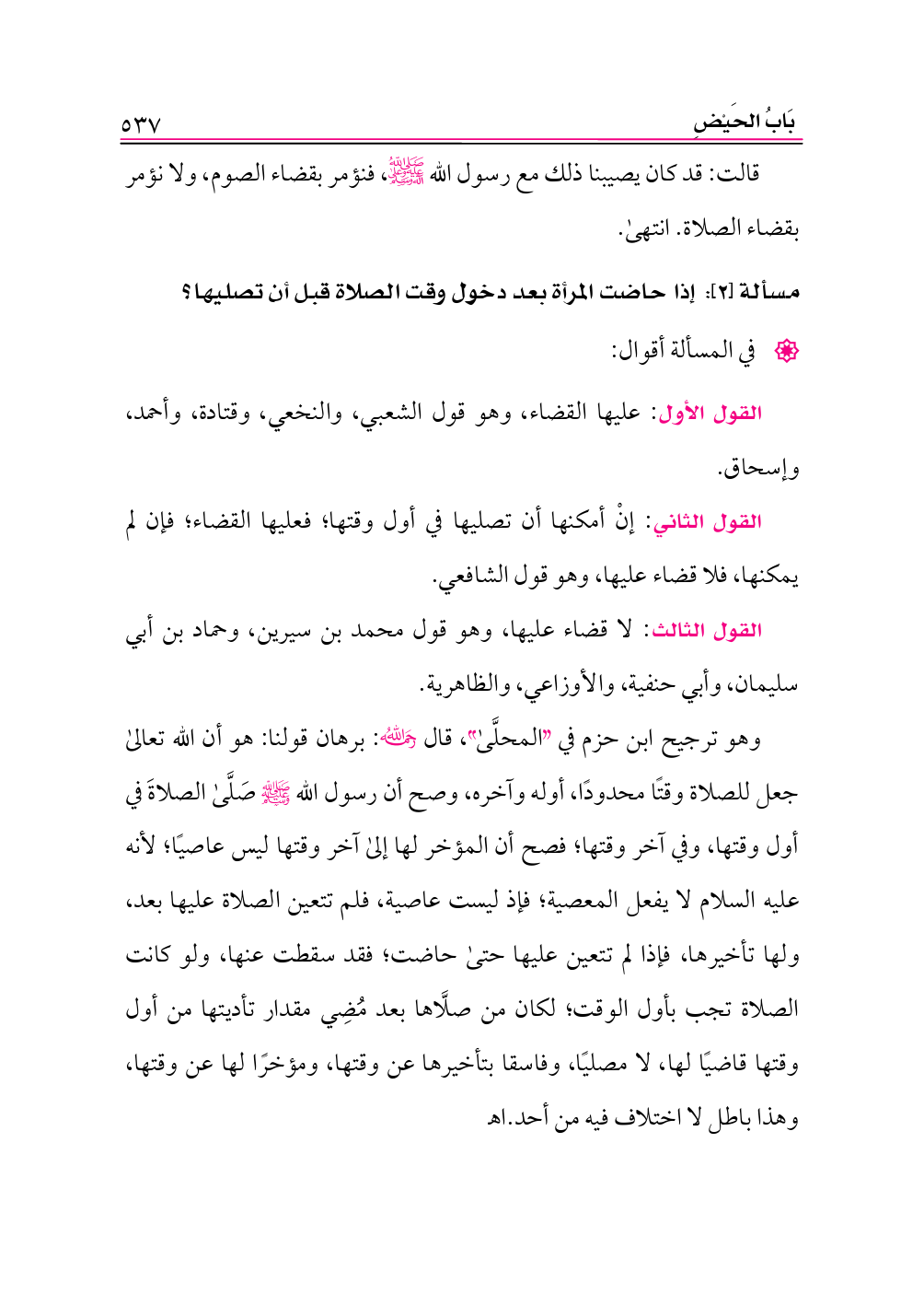 وهو ترجيح ابن حزم في «المحلَّى»، قال -رحمه الله-: برهان قولنا: هو أن الله تعالى جعل للصلاة وقتًا محدودًا، أوله وآخره، وصح أن رسول الله - صلى الله عليه وسلم - صَلَّى الصلاةَ في أول وقتها، وفي آخر وقتها؛ فصح أن المؤخر لها إلى آخر وقتها ليس عاصيًا؛ لأنه عليه السلام لا يفعل المعصية؛ فإذ ليست عاصية، فلم تتعين الصلاة عليها بعد، ولها تأخيرها، فإذا لم تتعين عليها حتى حاضت؛ فقد سقطت عنها، ولو كانت الصلاة تجب بأول الوقت؛ لكان من صلَّاها بعد مُضِي مقدار تأديتها من أول وقتها قاضيًا لها، لا مصليًا، وفاسقا بتأخيرها عن وقتها، ومؤخرًا لها عن وقتها، وهذا باطل لا اختلاف فيه من أحد. اهـ