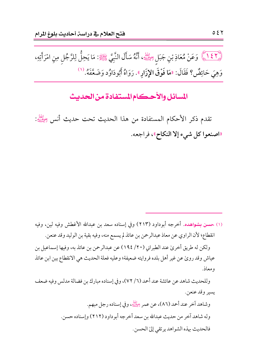 ١٤٢ - وَعَنْ مُعَاذِ بْنِ جَبَلٍ -رضي الله عنه-، أَنَّهُ سَأَلَ النَّبِيَّ - صلى الله عليه وسلم -: مَا يَحِلُّ لِلرَّجُلِ مِنِ امْرَأَتِهِ، وَهِيَ حَائِضٌ؟ فَقَالَ: «مَا فَوْقَ الإِزَارِ». رَوَاهُ أَبُودَاوُد وَضَعَّفَهُ. (¬١)