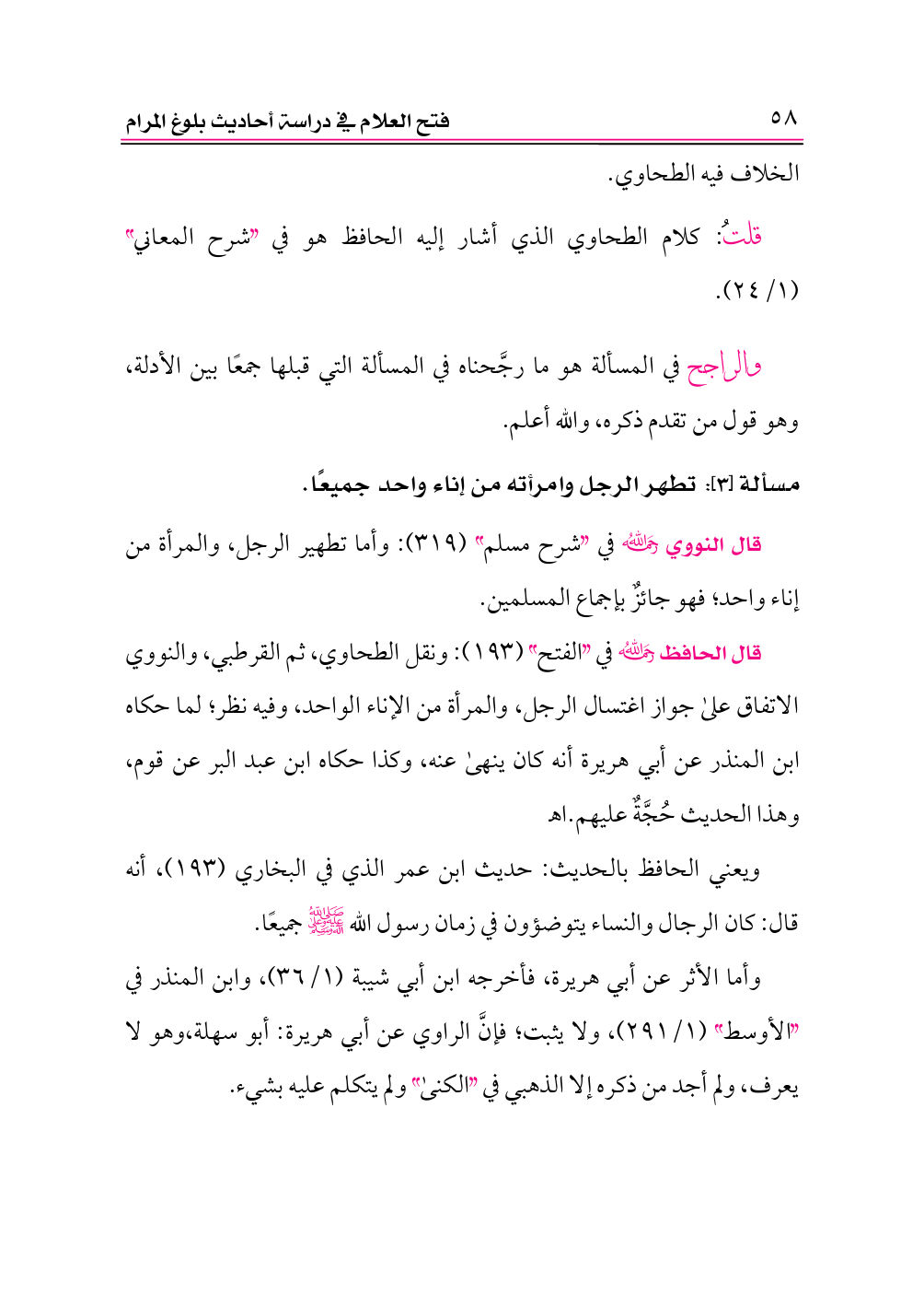 قال الحافظ -رحمه الله- في «الفتح» (١٩٣): ونقل الطحاوي، ثم القرطبي، والنووي الاتفاق على جواز اغتسال الرجل، والمرأة من الإناء الواحد، وفيه نظر؛ لما حكاه ابن المنذر عن أبي هريرة أنه كان ينهى عنه، وكذا حكاه ابن عبد البر عن قوم، وهذا الحديث حُجَّةٌ عليهم. اهـ