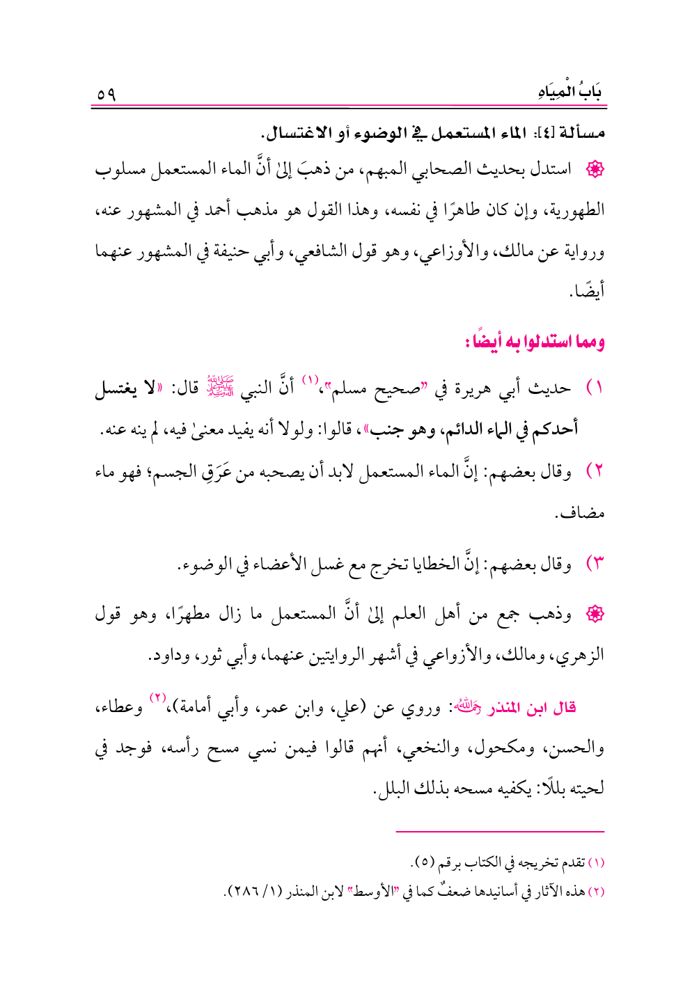 • وذهب جمع من أهل العلم إلى أنَّ المستعمل ما زال مطهرًا، وهو قول الزهري، ومالك، والأزواعي في أشهر الروايتين عنهما، وأبي ثور، وداود.