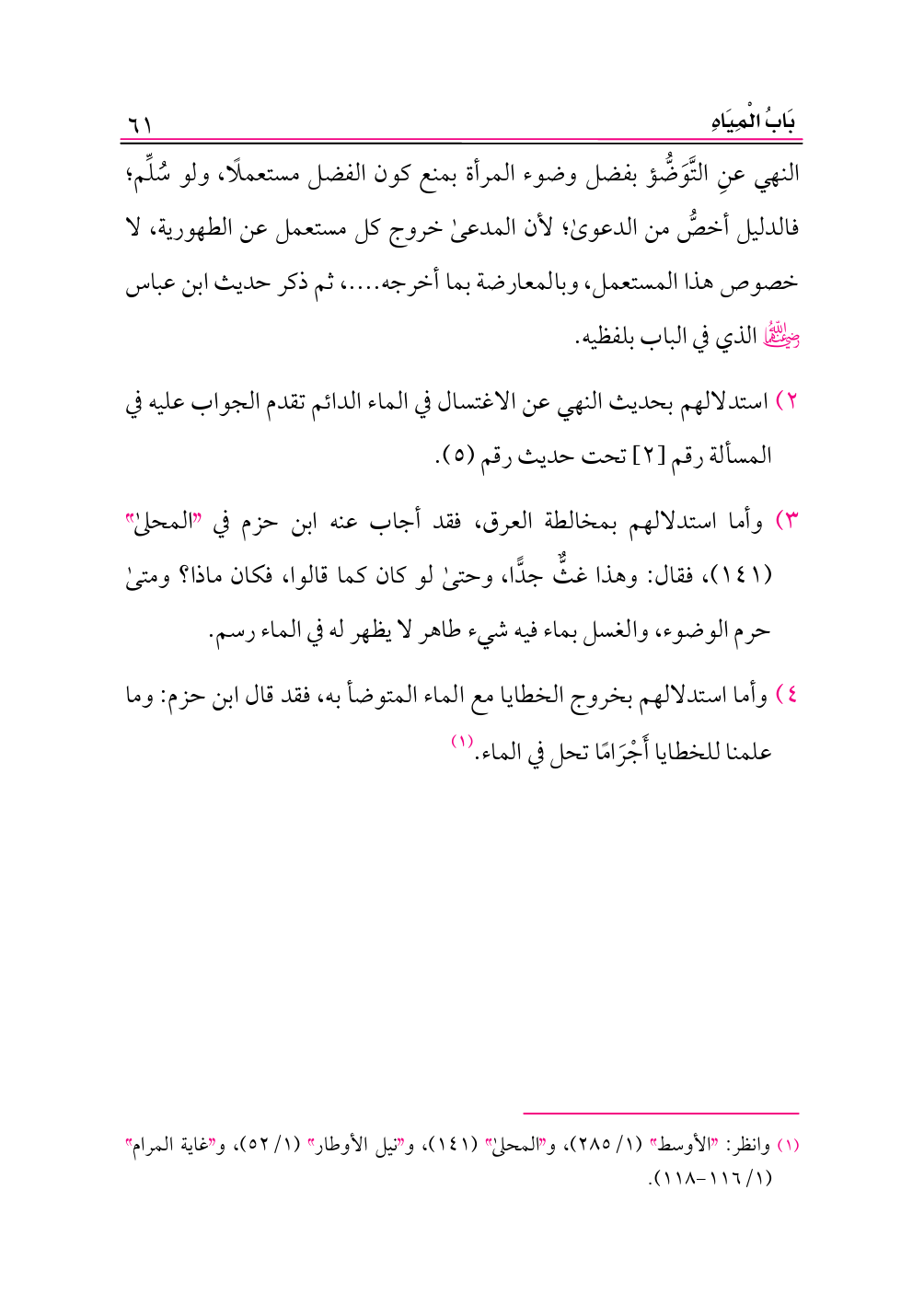 النهي عنِ التَّوَضُّؤ بفضل وضوء المرأة بمنع كون الفضل مستعملًا، ولو سُلِّم؛ فالدليل أخصُّ من الدعوى؛ لأن المدعى خروج كل مستعمل عن الطهورية، لا خصوص هذا المستعمل، وبالمعارضة بما أخرجه .... ، ثم ذكر حديث ابن عباس -رضي الله عنهما- الذي في الباب بلفظيه.