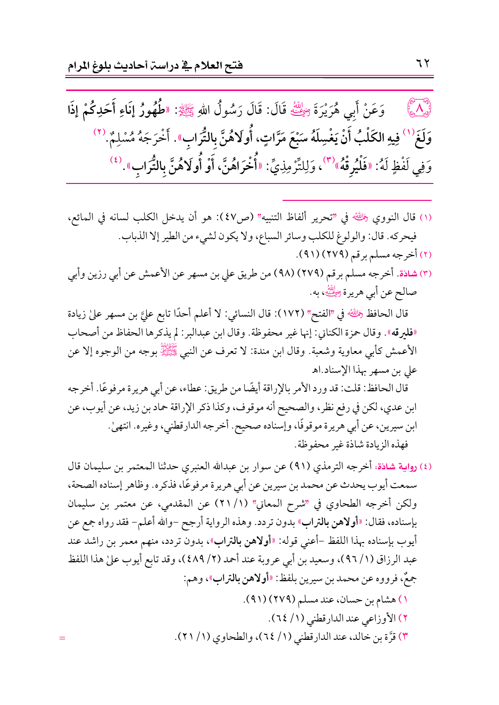 (¬٤) رواية شاذة: أخرجه الترمذي (٩١) عن سوار بن عبدالله العنبري حدثنا المعتمر بن سليمان قال سمعت أيوب يحدث عن محمد بن سيرين عن أبي هريرة مرفوعًا، فذكره. وظاهر إسناده الصحة، ولكن أخرجه الطحاوي في «شرح المعاني» (١/ ٢١) عن المقدمي، عن معتمر بن سليمان بإسناده، فقال: «أولاهن بالتراب» بدون تردد. وهذه الرواية أرجح -والله أعلم- فقد رواه جمع عن أيوب بإسناده بهذا اللفظ -أعني قوله: «أولاهن بالتراب»، بدون تردد، منهم معمر بن راشد عند عبد الرزاق (١/ ٩٦)، وسعيد بن أبي عروبة عند أحمد (٢/ ٤٨٩)، وقد تابع أيوب على هذا اللفظ جمعٌ، فرووه عن محمد بن سيرين بلفظ: «أولاهن بالتراب»، وهم: