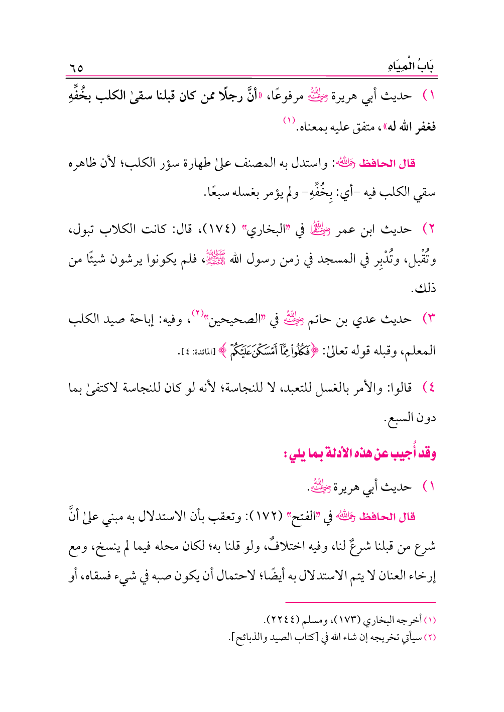 ٢) حديث ابن عمر -رضي الله عنهما- في «البخاري» (١٧٤)، قال: كانت الكلاب تبول، وتُقْبل، وتُدْبِر في المسجد في زمن رسول الله -صلى الله عليه وعلى آله وسلم-، فلم يكونوا يرشون شيئًا من ذلك.