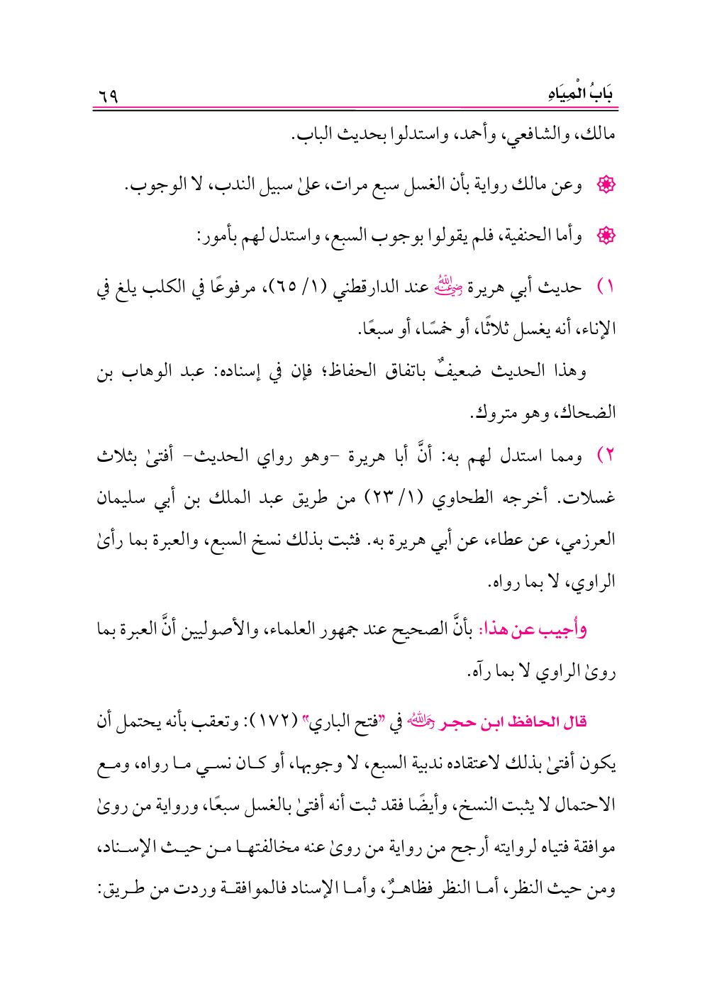 قال الحافظ ابن حجر -رحمه الله- في «فتح الباري» (١٧٢): وتعقب بأنه يحتمل أن يكون أفتى بذلك لاعتقاده ندبية السبع، لا وجوبها، أو كان نسي ما رواه، ومع الاحتمال لا يثبت النسخ، وأيضًا فقد ثبت أنه أفتى بالغسل سبعًا، ورواية من روى موافقة فتياه لروايته أرجح من رواية من روى عنه مخالفتها من حيث الإسناد، ومن حيث النظر، أما النظر فظاهرٌ، وأما الإسناد فالموافقة وردت من طريق: