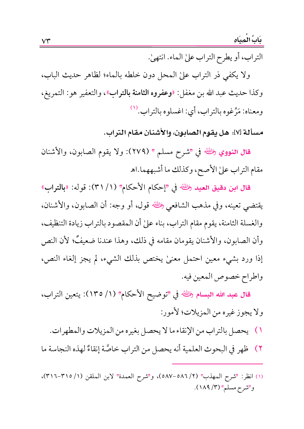 قال عبد الله البسام -رحمه الله- في «توضيح الأحكام» (١/ ١٣٥): يتعين التراب، ولا يجوز غيره من المزيلات؛ لأمور: