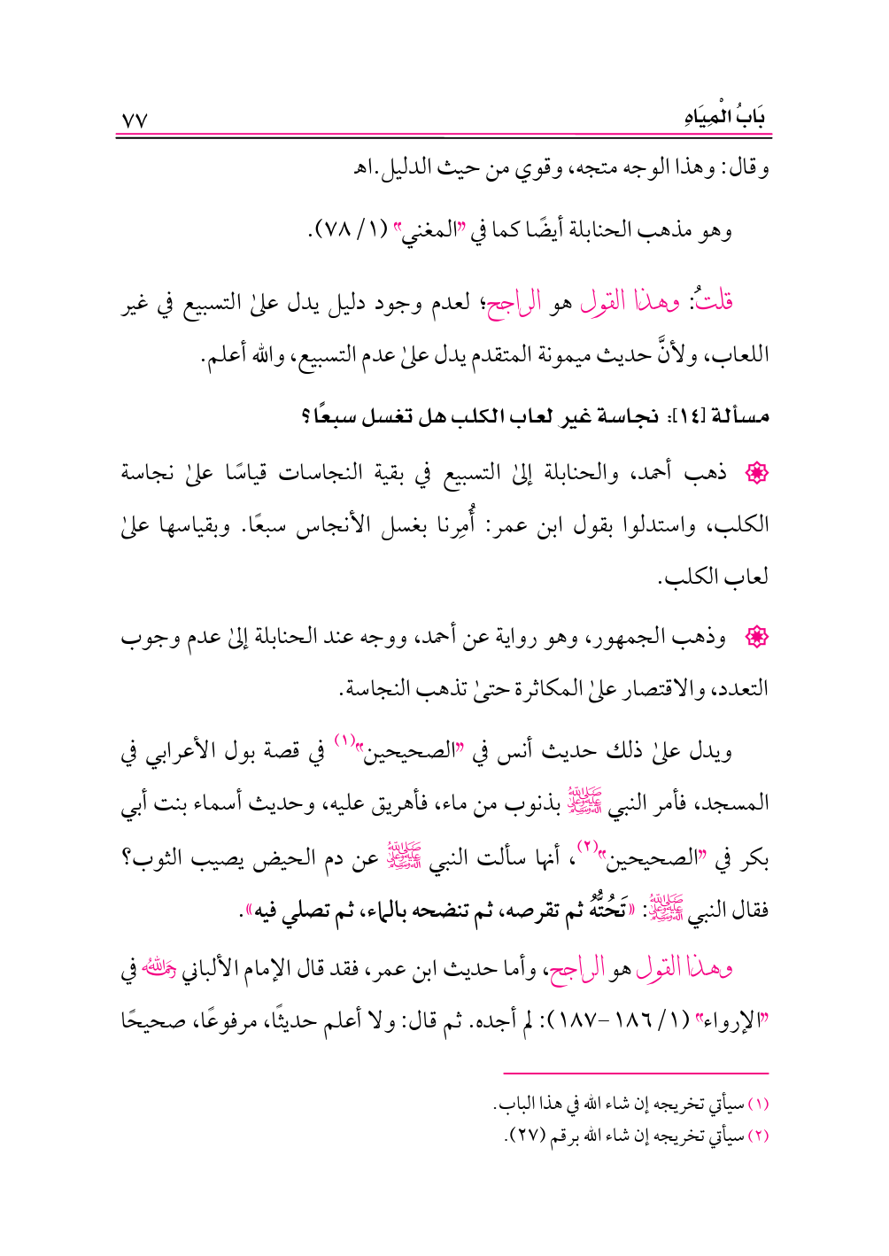 وهذا القول هو الراجح، وأما حديث ابن عمر، فقد قال الإمام الألباني -رحمه الله- في «الإرواء» (١/ ١٨٦ - ١٨٧): لم أجده. ثم قال: ولا أعلم حديثًا، مرفوعًا، صحيحًا