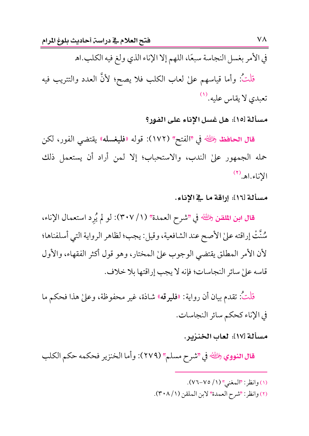 قلتُ: وأما قياسهم على لعاب الكلب فلا يصح؛ لأنَّ العدد والتتريب فيه تعبدي لا يقاس عليه. (¬١)