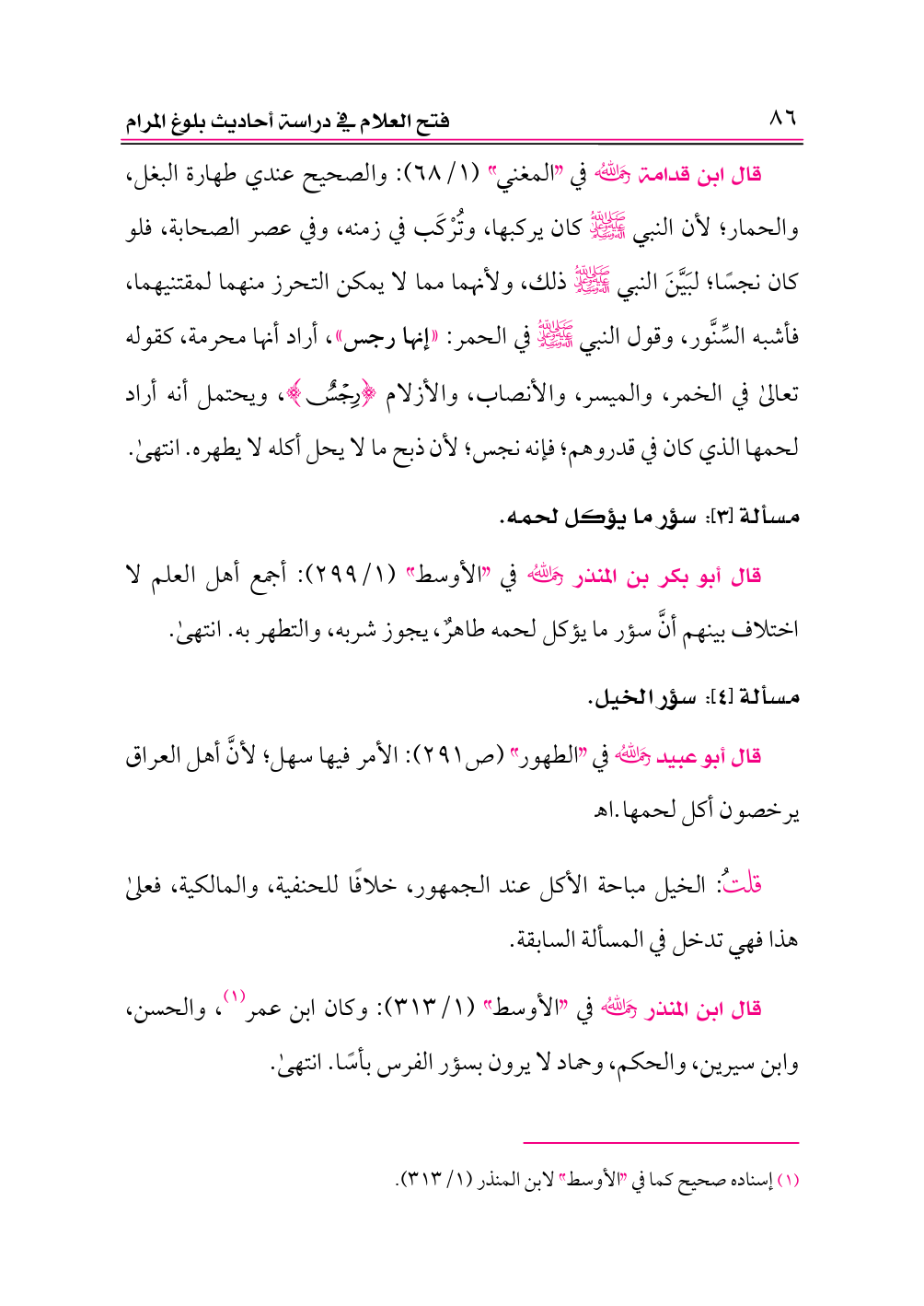 قال ابن قدامة -رحمه الله- في «المغني» (١/ ٦٨): والصحيح عندي طهارة البغل، والحمار؛ لأن النبي -صلى الله عليه وعلى آله وسلم- كان يركبها، وتُرْكَب في زمنه، وفي عصر الصحابة، فلو كان نجسًا؛ لبَيَّنَ النبي -صلى الله عليه وعلى آله وسلم- ذلك، ولأنهما مما لا يمكن التحرز منهما لمقتنيهما، فأشبه السِّنَّور، وقول النبي -صلى الله عليه وعلى آله وسلم- في الحمر: «إنها رجس»، أراد أنها محرمة، كقوله تعالى في الخمر، والميسر، والأنصاب، والأزلام {رِجْسٌ}، ويحتمل أنه أراد لحمها الذي كان في قدروهم؛ فإنه نجس؛ لأن ذبح ما لا يحل أكله لا يطهره. انتهى.