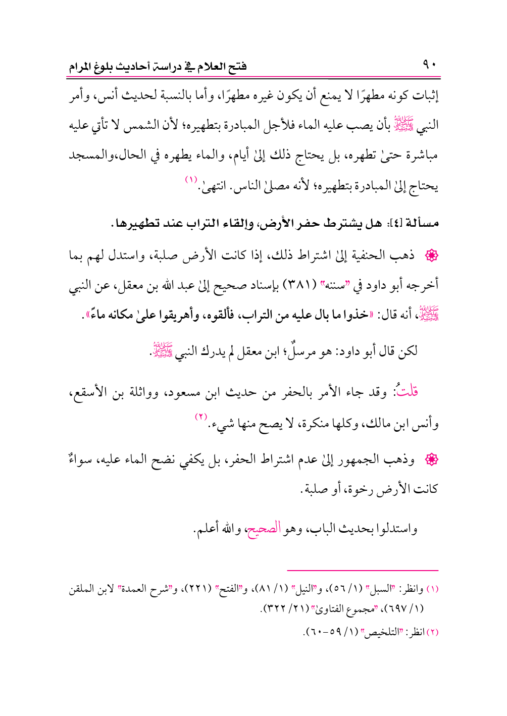 • وذهب الجمهور إلى عدم اشتراط الحفر، بل يكفي نضح الماء عليه، سواءٌ كانت الأرض رخوة، أو صلبة.