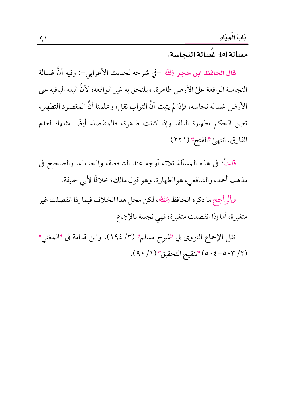 قال الحافظ ابن حجر -رحمه الله- -في شرحه لحديث الأعرابي -: وفيه أنَّ غسالة النجاسة الواقعة على الأرض طاهرة، ويلتحق به غير الواقعة؛ لأنَّ البلة الباقية على الأرض غسالة نجاسة، فإذا لم يثبت أنَّ التراب نقل، وعلمنا أنَّ المقصود التطهير، تعين الحكم بطهارة البلة، وإذا كانت طاهرة، فالمنفصلة أيضًا مثلها؛ لعدم الفارق. انتهى «الفتح» (٢٢١).