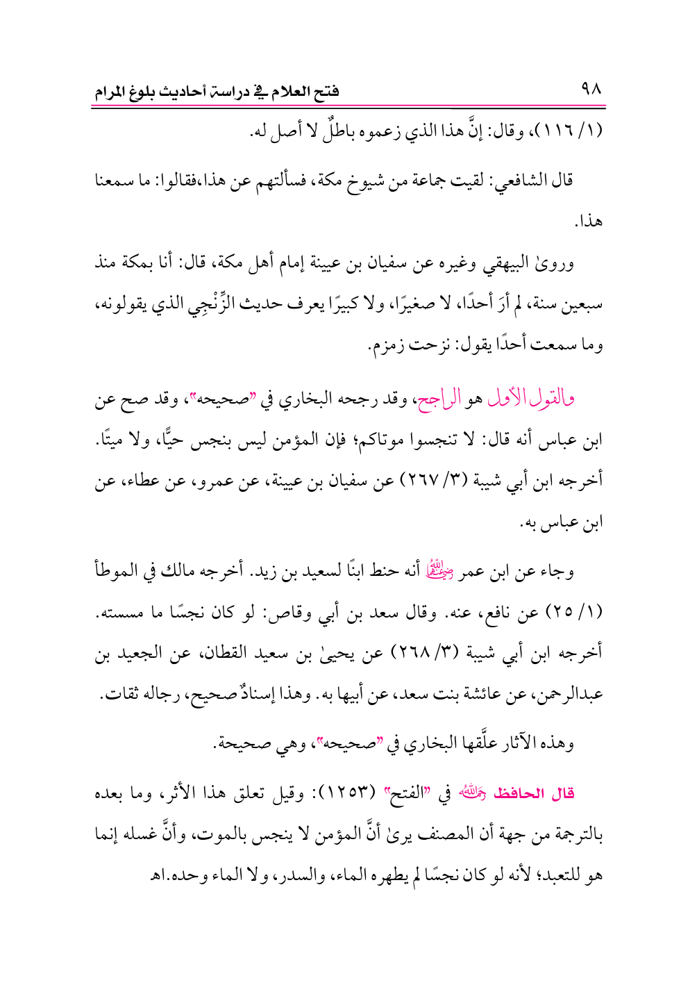 والقول الأول هو الراجح، وقد رجحه البخاري في «صحيحه»، وقد صح عن ابن عباس أنه قال: لا تنجسوا موتاكم؛ فإن المؤمن ليس بنجس حيًّا، ولا ميتًا. أخرجه ابن أبي شيبة (٣/ ٢٦٧) عن سفيان بن عيينة، عن عمرو، عن عطاء، عن ابن عباس به.