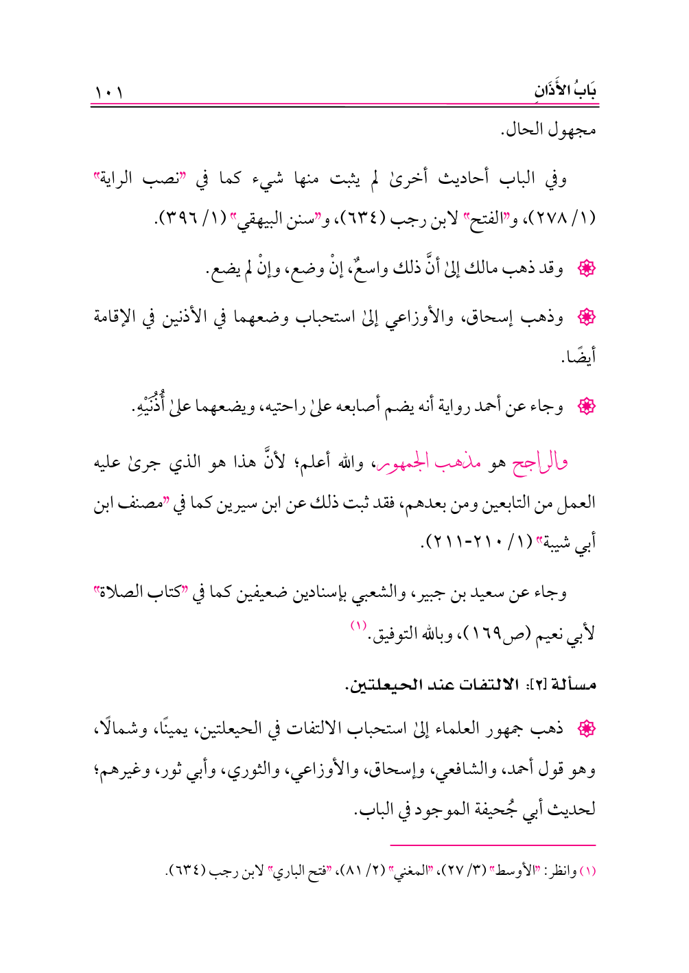 • ذهب جمهور العلماء إلى استحباب الالتفات في الحيعلتين، يمينًا، وشمالًا، وهو قول أحمد، والشافعي، وإسحاق، والأوزاعي، والثوري، وأبي ثور، وغيرهم؛ لحديث أبي جُحيفة الموجود في الباب.