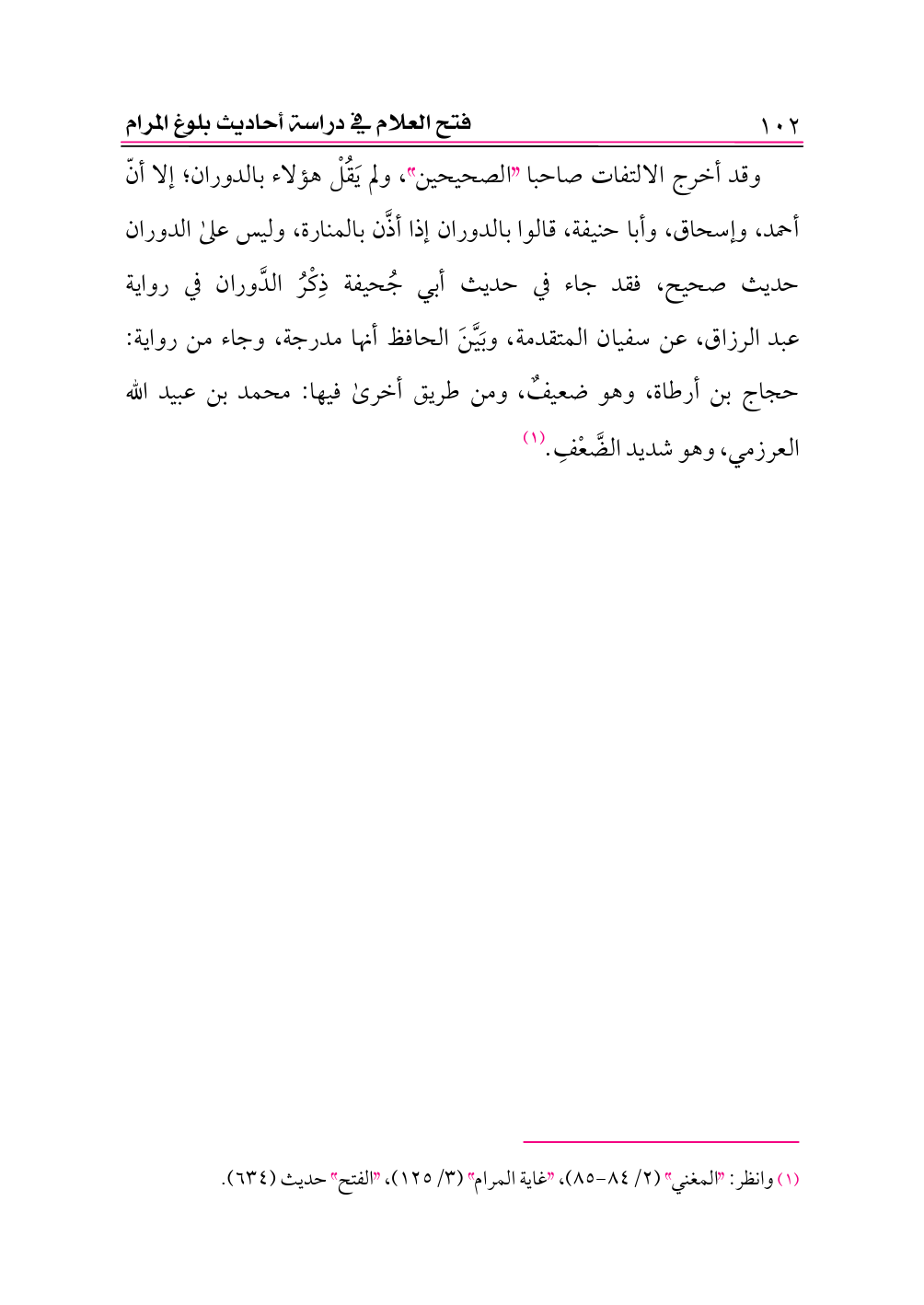 وقد أخرج الالتفات صاحبا «الصحيحين»، ولم يَقُلْ هؤلاء بالدوران؛ إلا أنّ أحمد، وإسحاق، وأبا حنيفة، قالوا بالدوران إذا أذَّن بالمنارة، وليس على الدوران حديث صحيح، فقد جاء في حديث أبي جُحيفة ذِكْرُ الدَّوران في رواية عبد الرزاق، عن سفيان المتقدمة، وبَيَّنَ الحافظ أنها مدرجة، وجاء من رواية: حجاج بن أرطاة، وهو ضعيفٌ، ومن طريق أخرى فيها: محمد بن عبيد الله العرزمي، وهو شديد الضَّعْفِ. (¬١)