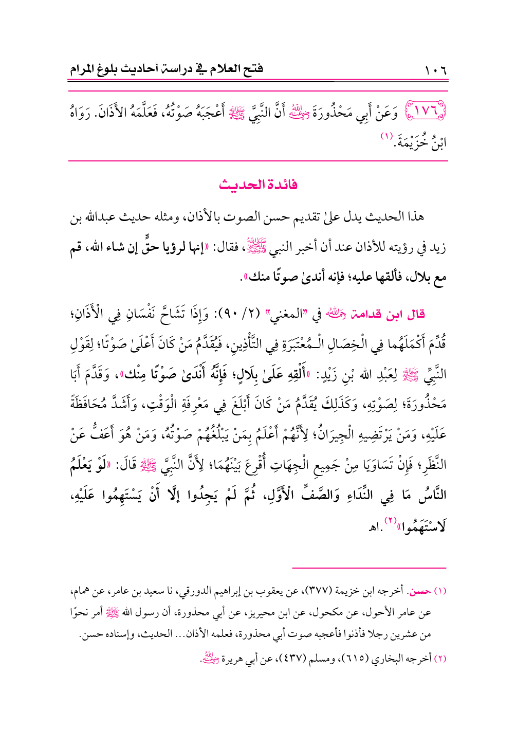 ١٧٦ - وَعَنْ أَبِي مَحْذُورَةَ -رضي الله عنه- أَنَّ النَّبِيَّ - صلى الله عليه وسلم - أَعْجَبَهُ صَوْتُهُ، فَعَلَّمَهُ الأَذَانَ. رَوَاهُ ابْنُ خُزَيْمَةَ. (¬١)