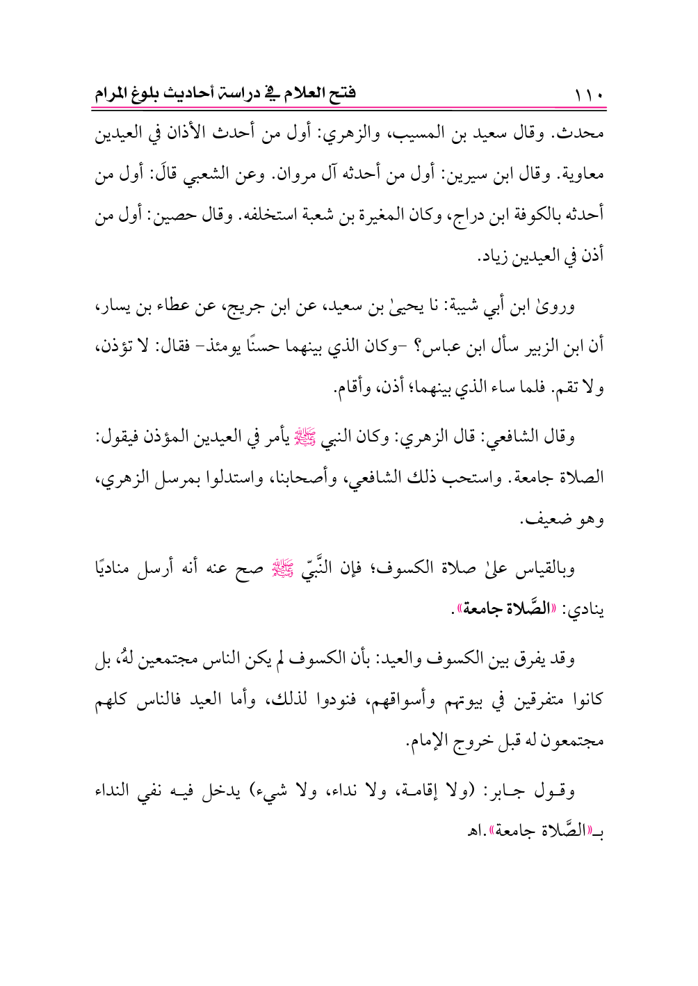 محدث. وقال سعيد بن المسيب، والزهري: أول من أحدث الأذان في العيدين معاوية. وقال ابن سيرين: أول من أحدثه آل مروان. وعن الشعبي قالَ: أول من أحدثه بالكوفة ابن دراج، وكان المغيرة بن شعبة استخلفه. وقال حصين: أول من أذن في العيدين زياد.