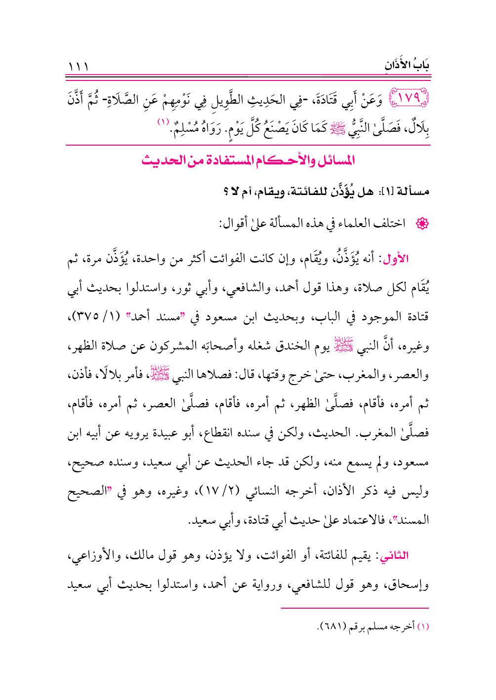 ١٧٩ - وَعَنْ أَبِي قَتَادَةَ، فِي الحَدِيثِ الطَّوِيلِ فِي نَوْمِهِمْ عَنِ الصَّلَاةِ ثُمَّ أَذَّنَ بِلَالٌ، فَصَلَّى النَّبِيُّ - صلى الله عليه وسلم - كَمَا كَانَ يَصْنَعُ كُلَّ يَوْمٍ. رَوَاهُ مُسْلِمٌ. (¬١)