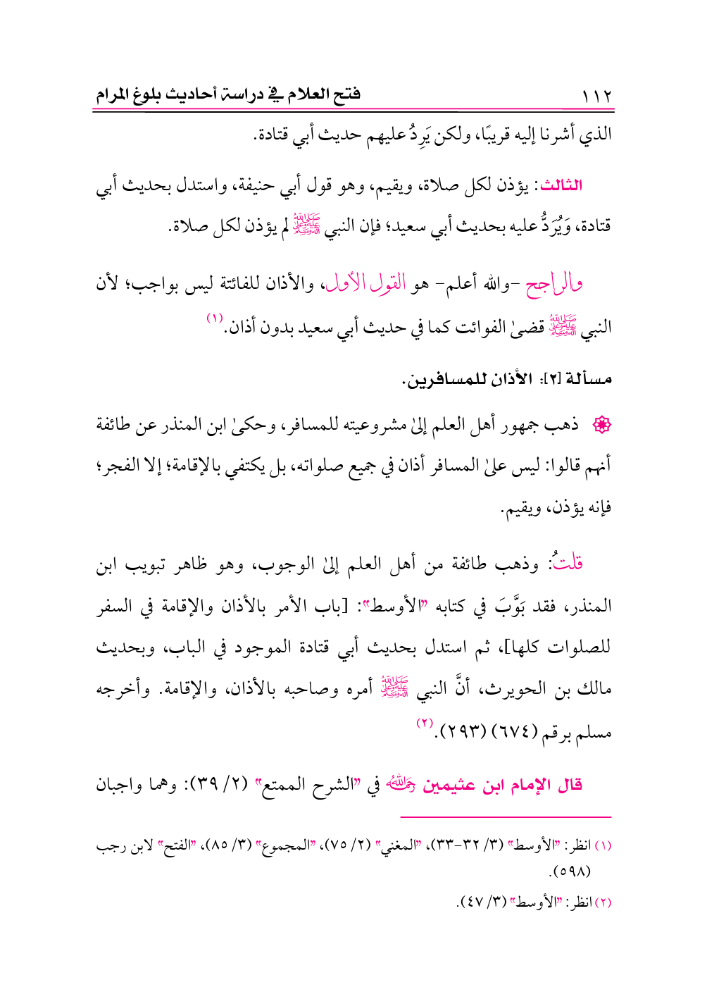 قلتُ: وذهب طائفة من أهل العلم إلى الوجوب، وهو ظاهر تبويب ابن المنذر، فقد بَوَّبَ في كتابه «الأوسط»: [باب الأمر بالأذان والإقامة في السفر للصلوات كلها]، ثم استدل بحديث أبي قتادة الموجود في الباب، وبحديث مالك بن الحويرث، أنَّ النبي -صلى الله عليه وعلى آله وسلم- أمره وصاحبه بالأذان، والإقامة. وأخرجه مسلم برقم (٦٧٤) (٢٩٣). (¬٢)