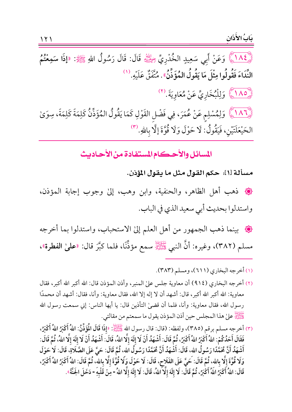(¬٣) أخرجه مسلم برقم (٣٨٥)، ولفظه: (قال: قال رسول الله -صلى الله عليه وعلى آله وسلم-: «إِذَا قَالَ المُؤَذِّنُ: اللهُ أَكْبَرُ اللهُ أَكْبَرُ، فَقَالَ أَحَدُكُمْ: اللهُ أَكْبَرُ اللهُ أَكْبَرُ، ثُمَّ قَالَ: أَشْهَدُ أَنْ لَا إِلَهَ إِلَّا اللهُ، قَالَ: أَشْهَدُ أَنْ لَا إِلَهَ إِلَّا اللهُ، ثُمَّ قَالَ: أَشْهَدُ أَنَّ مُحَمَّدًا رَسُولُ اللهِ، قَالَ: أَشْهَدُ أَنَّ مُحَمَّدًا رَسُولُ اللهِ، ثُمَّ قَالَ: حَيَّ عَلَى الصَّلَاةِ، قَالَ: لَا حَوْلَ وَلَا قُوَّةَ إِلَّا بِاللهِ، ثُمَّ قَالَ: حَيَّ عَلَى الفَلَاحِ، قَالَ: لَا حَوْلَ وَلَا قُوَّةَ إِلَّا بِاللهِ، ثُمَّ قَالَ: اللهُ أَكْبَرُ اللهُ أَكْبَرُ، قَالَ: اللهُ أَكْبَرُ اللهُ أَكْبَرُ، ثُمَّ قَالَ: لَا إِلَهَ إِلَّا اللهُ، قَالَ: لَا إِلَهَ إِلَّا اللهُ مِنْ قَلْبِهِ دَخَلَ الجَنَّةَ».
