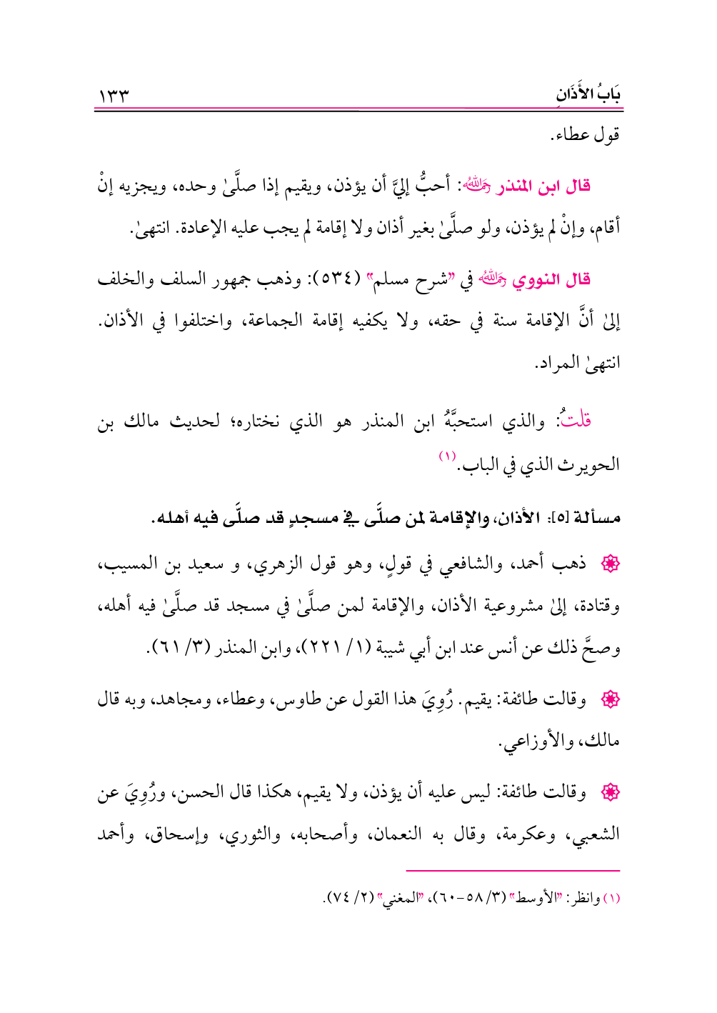 قلتُ: والذي استحبَّهُ ابن المنذر هو الذي نختاره؛ لحديث مالك بن الحويرث الذي في الباب. (¬١)