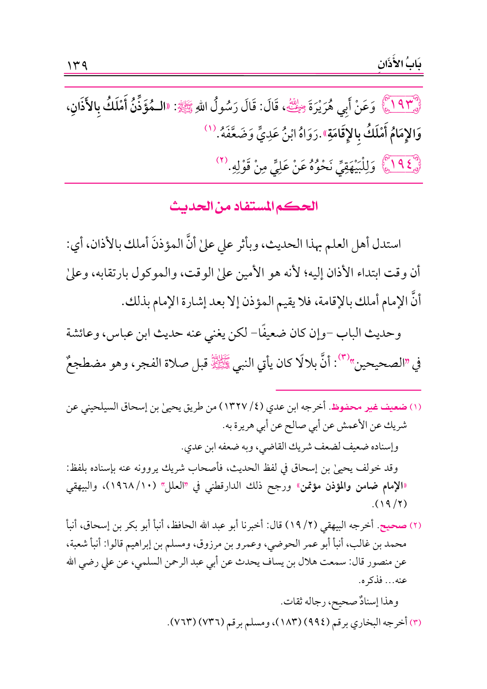 ١٩٣ - وَعَنْ أَبِي هُرَيْرَةَ -رضي الله عنه-، قَالَ: قَالَ رَسُولُ اللهِ - صلى الله عليه وسلم -: «المُؤَذِّنُ أَمْلَكُ بِالأَذَانِ، وَالإِمَامُ أَمْلَكُ بِالإِقَامَةِ».رَوَاهُ ابْنُ عَدِيٍّ وَضَعَّفَهُ. (¬١)