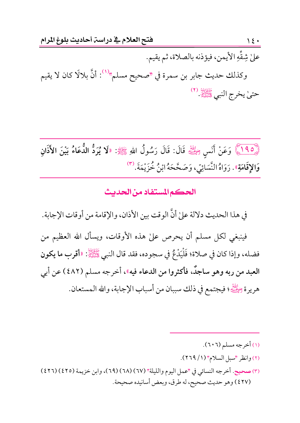 ١٩٥ - وَعَنْ أَنَسٍ -رضي الله عنه- قَالَ: قَالَ رَسُولُ اللهِ - صلى الله عليه وسلم -: «لَا يُرَدُّ الدُّعَاءُ بَيْنَ الأَذَانِ وَالإِقَامَةِ». رَوَاهُ النَّسَائِيّ، وَصَحَّحَهُ ابْنُ خُزَيْمَةَ. (¬٣)