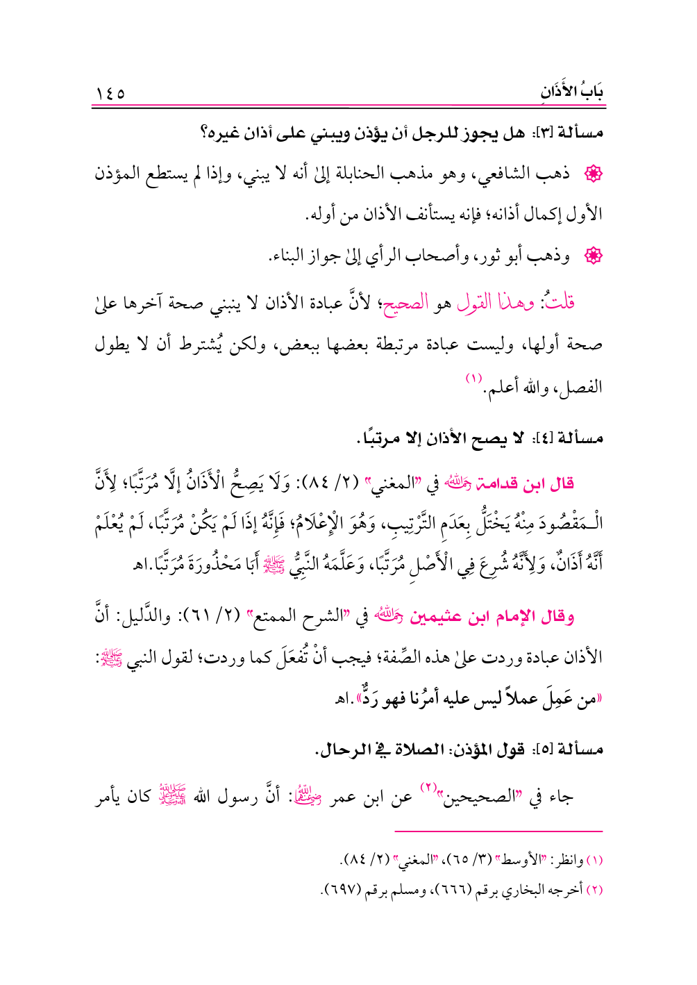 قلتُ: وهذا القول هو الصحيح؛ لأنَّ عبادة الأذان لا ينبني صحة آخرها على صحة أولها، وليست عبادة مرتبطة بعضها ببعض، ولكن يُشترط أن لا يطول الفصل، والله أعلم. (¬١)
