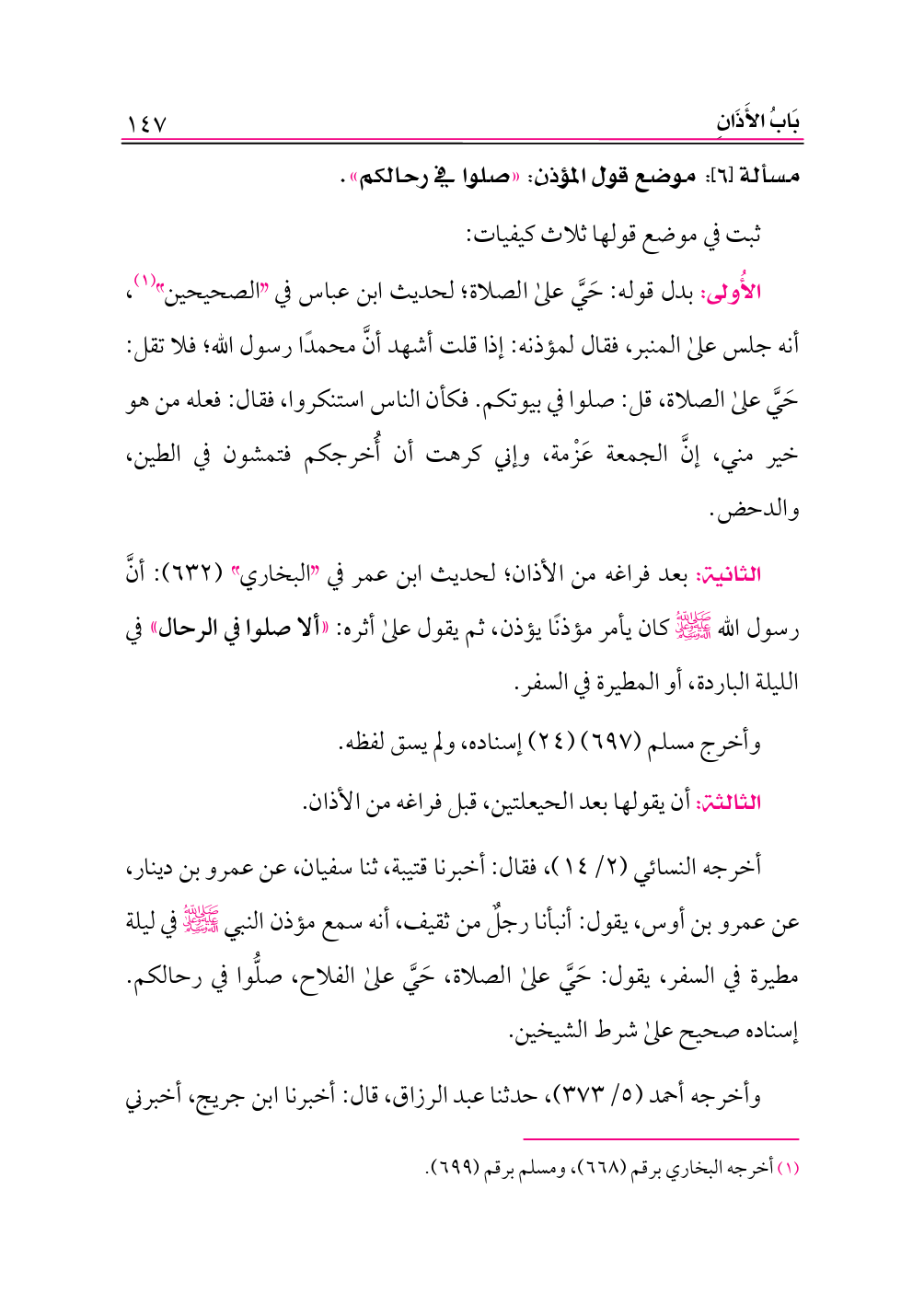 مسألة [٦]: موضع قول المؤذن: «صلوا في رحالكم».