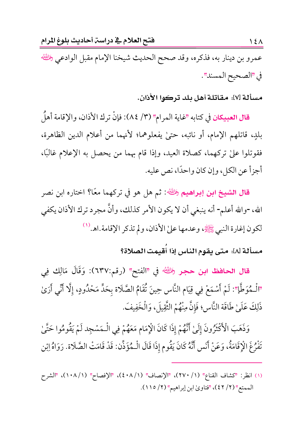 قال الشيخ ابن إبراهيم -رحمه الله-: ثم هل هو في تركهما معًا؟ اختاره ابن نصر الله، والله أعلم أنه ينبغي أن لا يكون الأمر كذلك، وأنَّ مجرد ترك الأذان يكفي لكون إغارة النبي - صلى الله عليه وسلم -، وعدمها على الأذان، ولم تذكر الإقامة. اهـ. (¬١)