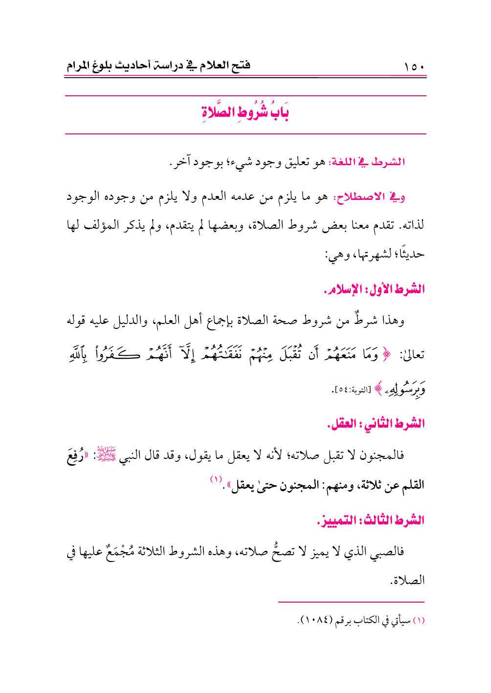 وفي الاصطلاح: هو ما يلزم من عدمه العدم ولا يلزم من وجوده الوجود لذاته. تقدم معنا بعض شروط الصلاة، وبعضها لم يتقدم، ولم يذكر المؤلف لها حديثًا؛ لشهرتها، وهي: